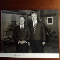 1930-2014, Politiker (CDU), Ministerpräsident von Niedersachsen, Vater von Ursula von der Leyen - Foto (ca. 4°quer, zus. mit Helmut Kohl) mit U. Beiliegt weiteres mit U. (zus. mit von Weizsäcker, von diesem Autopen-U.) und Begleitbrief seines Sekretariats, Hannover 21.10.1985. Beiliegen 4 FDC und 7 SK, je mit U.
