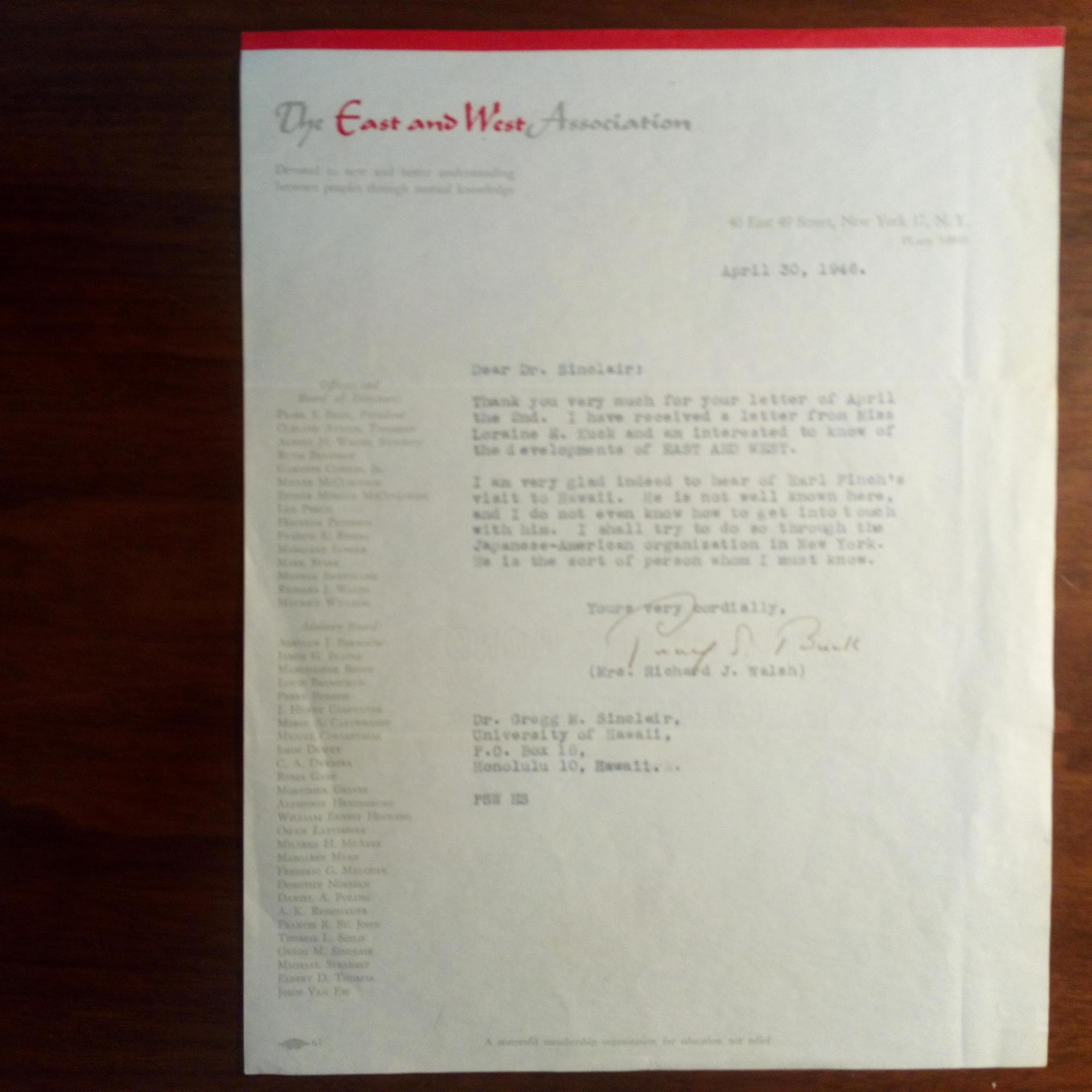 1892-1973, US-Schriftst. - Br. m. U., 1 S. 4°, Br.kopf als Präs. der "East and West Ass.", New York 10.4.1946. An den Dir. der Universtät Honolulu, den Literaturwiss. Gregg M. Sinclair (1890-1976): ...am very glad to hear of Earl Finch's visit . I do not even know how to get in touch with him. I shall try to do so through the Japanese-American organisation...