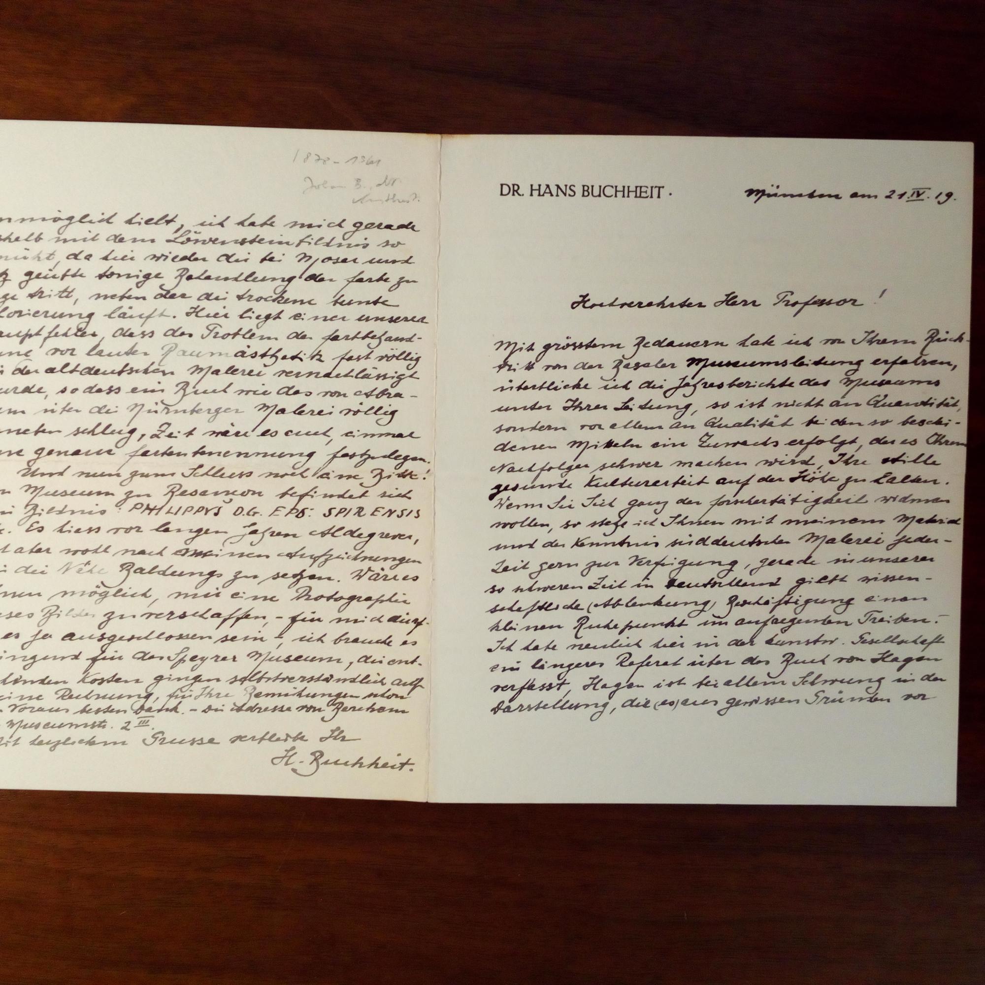 1878-1961, Kunsthistoriker, Museologe - E. Brief mit U., München 21.4.1919, 4 S. kl. 4°, kl. und dicht geschr. An einen Prof. in Basel: Bedauert dessen "Rücktritt von der Museumsleitung". Hagen sei in seinem neuen Buche ein "Schlamper und Fälscher" bezügl. Grünewald: ...Der Altar ist auch nie in Isenheim (nur Kloster!) gemalt, sondern in einer stabilen Werkstätte, Mainz, die uns Sandart nennt, da er doch aus direkter Werkstadttradition schöpftte... Erbittet Kopie e. Bildes aus d. Museum von Besançon u.a.