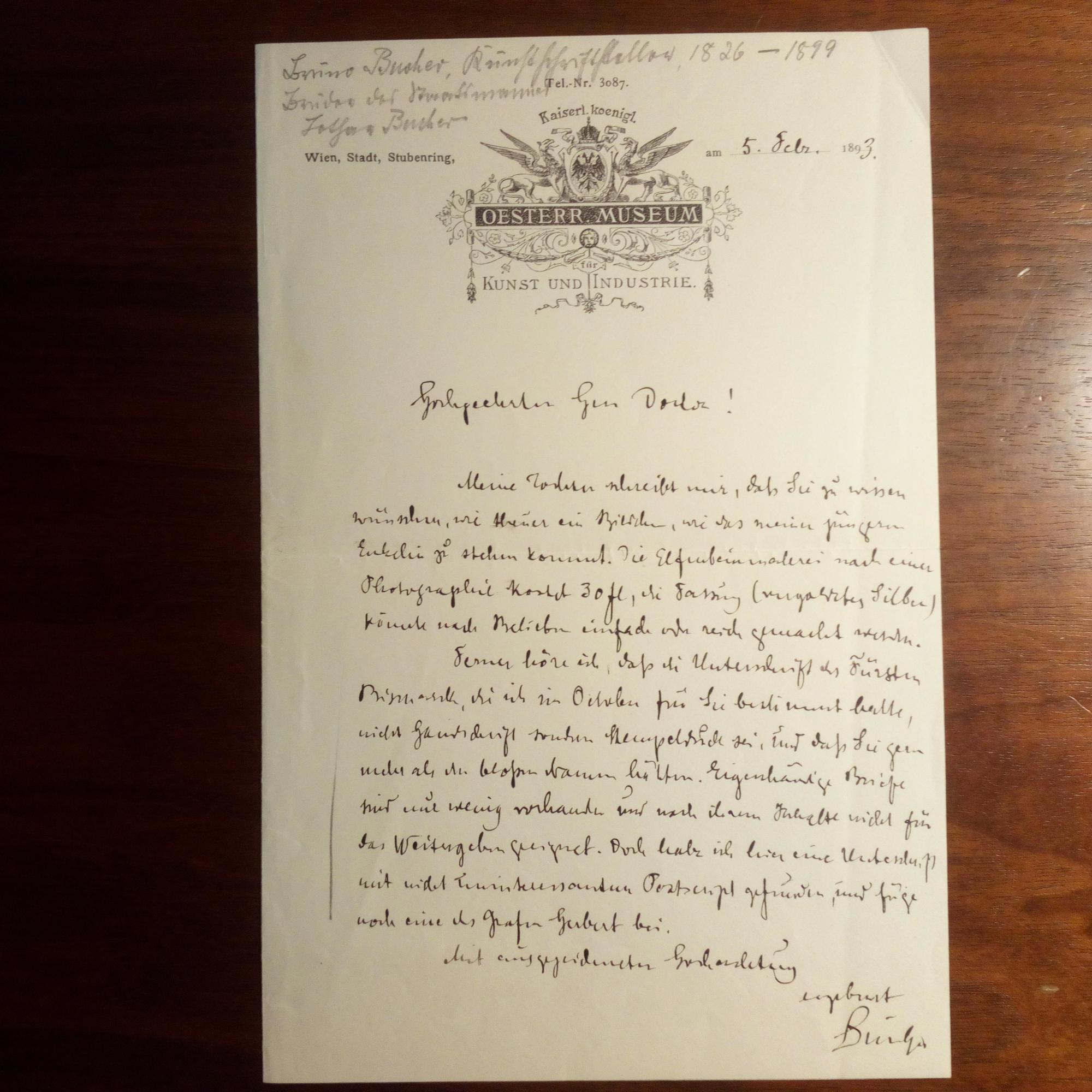 1826-99, Kunstschriftsteller - E. Br. m. U., (Wien) 5.2.1893, Br.kopf des "Museums für Kunst und Industrie". Betr. einer Anfrage nach Autographen: ...Ferner höre ich, daß die Unterschrift des Fürsten Bismarck ... Stempeldruck sei ... Eigenhändige Briefe sind nur wenig vorhanden und nach ihrem Inhalt nicht für das Weitergeben geeignet...