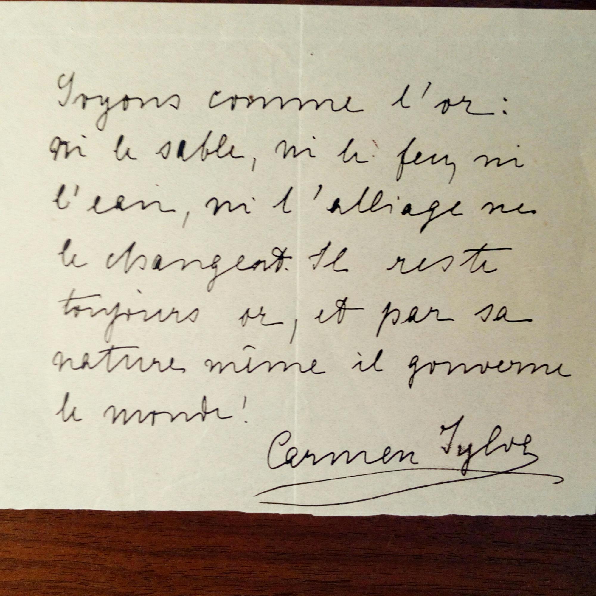 1843-1916, Pseudonym für Königin Elisabeth von Rumänien, Schriftstellerin - Blatt (auf ca. ½ S. kl. 4° beschn.) Mit e. Zitat und U. "Soyons comme l'or: ni le sable, ni le feu, ni l'eau, ni l'alliage ne le change-ant...". Beiliegt Repro eines Fotos (am Schreibtisch).