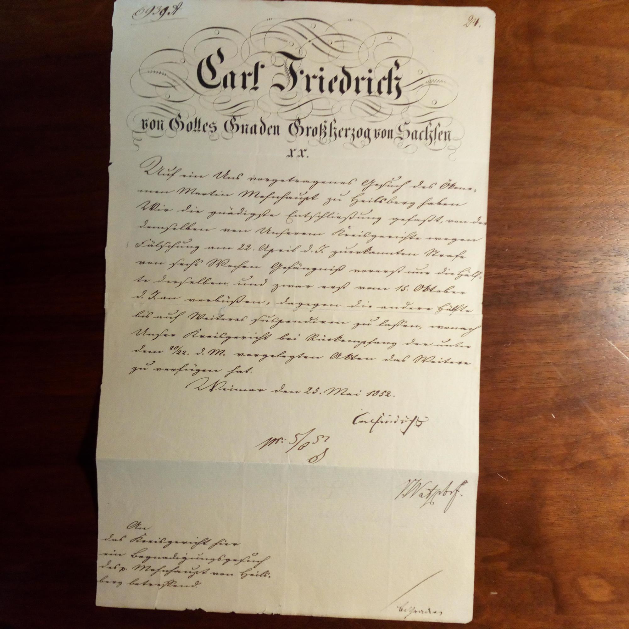 1783-1853, Großherzog, Sohn von Goethe's Freund Carl August - Amtl. Br. m. U., 2 Gegenzeichnungen, Weimar 25.5.1852, 1 S. 4°, Br.kopf. An das Kriegsgericht ein Gnaden-gesuch betreffend: Von einer achtwöchigen Gefängnisstrafe wegen "Fälschung" ist vorerst nur die Hälfte zu vollziehen.