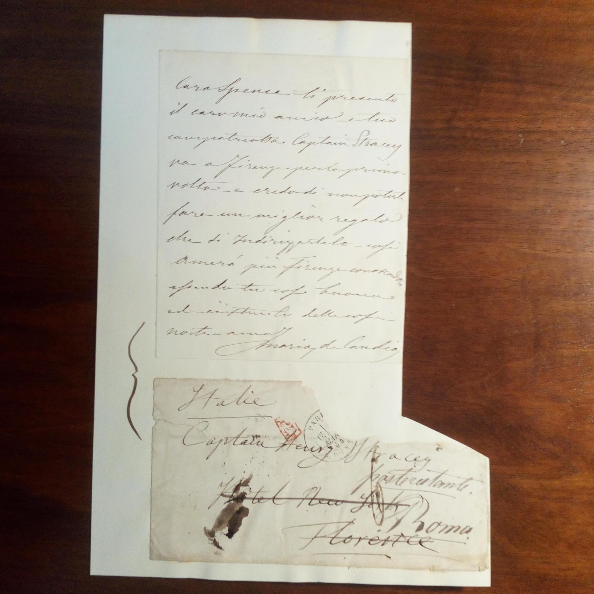 spätere Mrs. Godfrey Pearse, 1853-1926, italien.-brit. Schriftstellerin und Gesellschaftsdame - E. Br. m. U., 1 S. kl.8°, m. e. postal. Umschlag (Paris März 1904, Marke ausgerissen, von Florenz nach Rom weitergeleitet ), mont. An Captain Henry Stracey: Empfehlungs-schreiben für diesen: "Caro Spence ti presento il caro amico...".