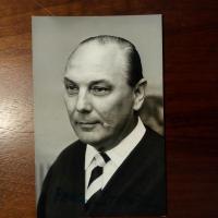 eigtl. Paul Karl Schmidt, 1911-97, Pressesprecher im 3.Reich, später Schriftst. über den 2.Weltkrieg - Pfo. m. U. (auf dunklem Grund kaum sichtbar), auf Rückseite weitere U. u. D. 30.9.1964.