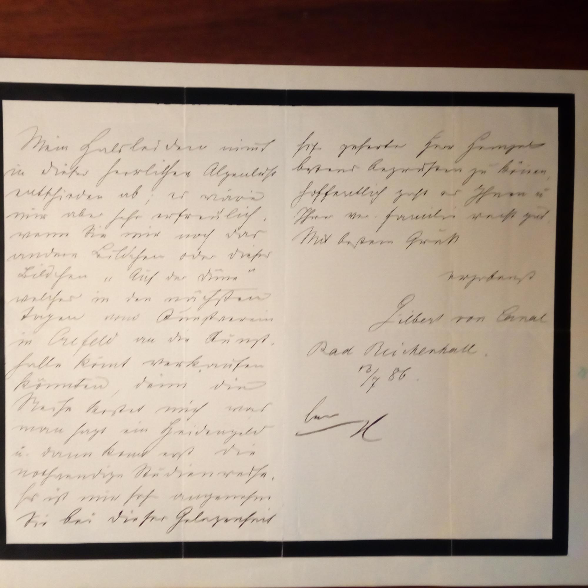 1849-1927, Maler - E. Brief mit U., Bad Reichen- hall 13.7.1886, 2 ½ S. 8°, schwarzer Rand hinterlegt, Erl.vermerk. An den Kunsthändler Karl Ernst Haensel (1868-1947) in Dresden betr. Verkaufs von Bildern ("Auf der Düne" u.a.).