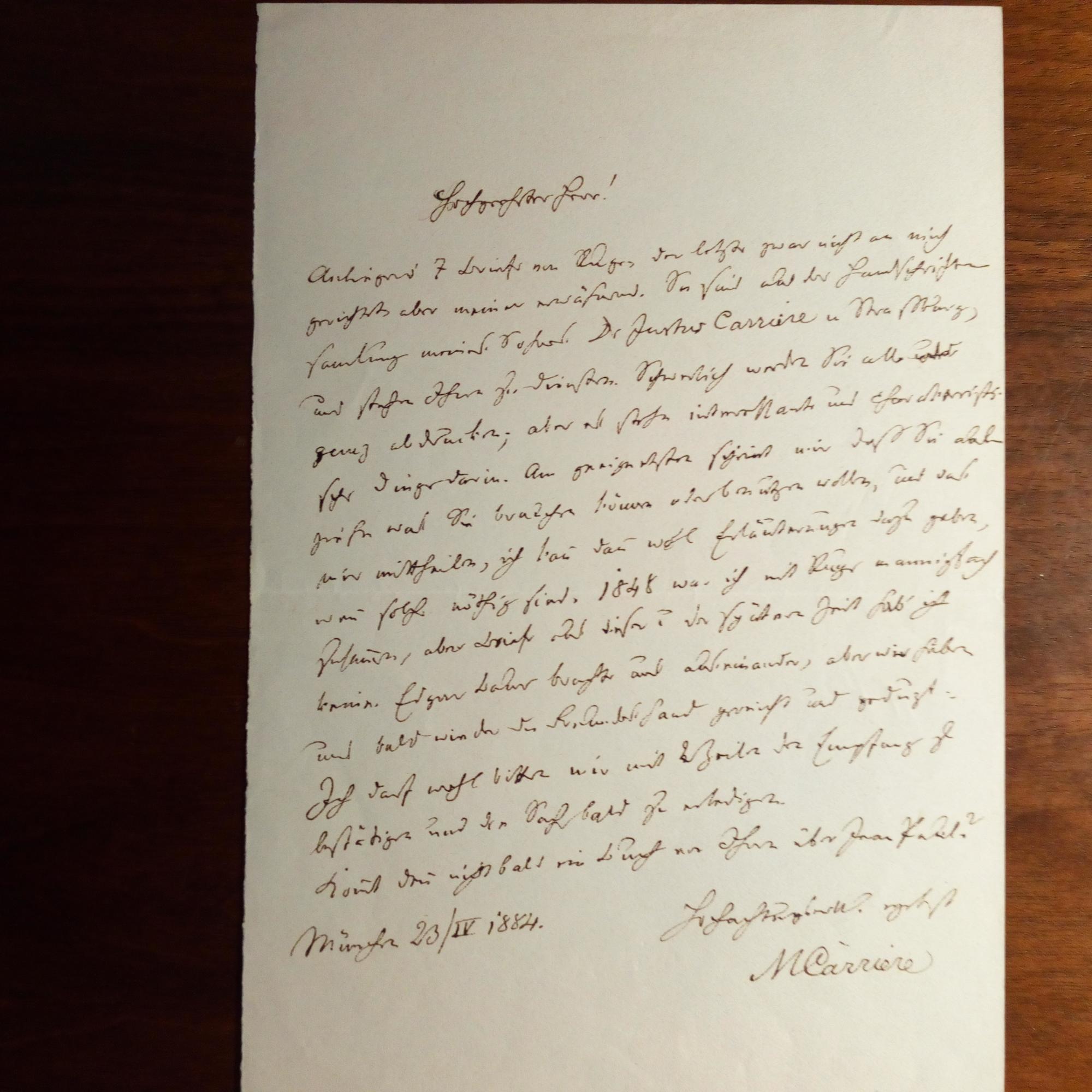 1817-95, Philosoph - 1. E. Brief mit U., München 4.4.1872, ¾ S. gr. 8°. "Verehrter Herr Laudator...Da Sie Michaelis und Bluntschli über die religiöse und kirchenpolitische Frage reden lassen, so bitte ich auch um das Wort; es muß doch gesagt werden, wo und wie Döllinger uns nicht genügt...". 2. E. Brief mit U., München 7.2.1875, 1 S. gr. 8°, Faltspur, kl. Randläsur, abklatschfleckig. An einen Kollegen: ...Wie lang sind wir außer persönlichem Verkehr! Wie oft hab' ich ihn und Ihre Stellung...zurückgewünscht...Reizt Sie etwas, z.B. die Behandlung Ihres Lieblings Walter Scott...Haben Sie denn endlich Ihre Epigramme...zusammengestellt und zur Herausgabe fertig gemacht?... 3. E. Brief mit U., München 23.4.1884, 1 S. 8°. An den Literaturwiss. Paul Nerrlich (1844-1904), der nach dem Schriftwechsel mit Arnold Ruge gefragt hatte: ...Briefe aus dieser u. der späteren Zeit hab' ich keine... 4. E. postal. Postkarte mit U. (München 2.12.1888). An den evang. Pfarrer u. Politiker Friedrich Lampert (1829-1901) in Ippesheim (Bayern): "Die Schillerstiftung, werther Herr Pfarrer, züchtet eigentlich keine Literaten, sondern will verdienstvollen Schriftstellern ein sorgenfreies Alter...gewähren...kann den Baron Schackschen Schwindel nicht befördern. Doch ist München dem Berliner Antrag einmaliger Unterstützung willfährig...". 5. E. Brief mit U., München 16.1.1890, 1 ½ S., kl. 8°. Er werde weg. seines Alters "nicht mehr in ein Prüfungscomité eintreten oder Vereinen mich anschließen". Erw. Otto von Leixner. Beiliegt Stahlstich-Porträt (aus Magazin).