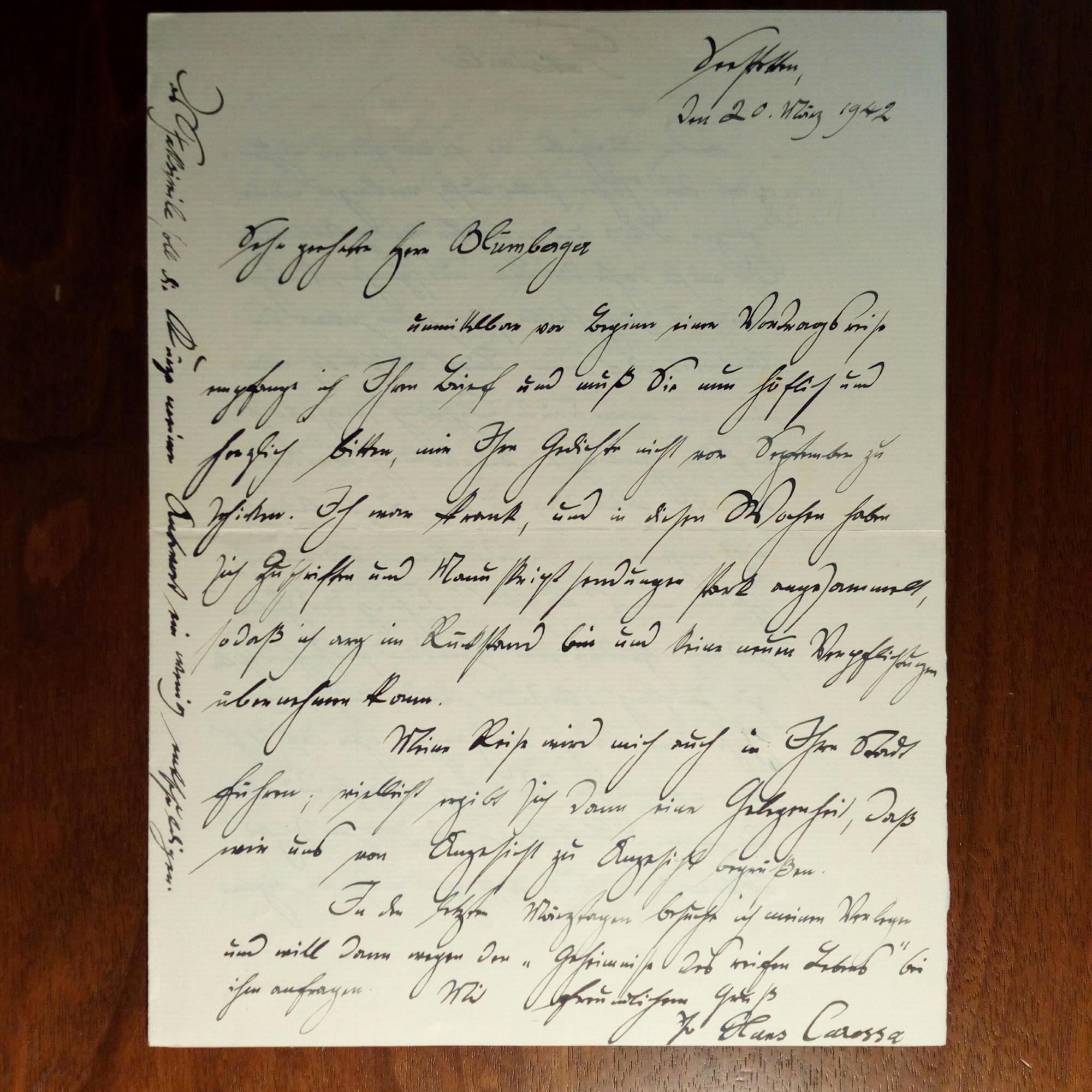 1878-1956, Schriftsteller - 1. Kl. 8°-Blatt mit e. Widm. mit U. für Magda von Hattingberg (1883-1959, Schriftstellerin und Pianistin, Schwägerin von Graf Dürckheim, Freundin von Rilke), München 25.12.1928. 2. E. postal. Ansichtskarte (histor. Aufnahme aus Passau) mit U., Bahnpost Seestetten 13.11.1930: Dankt Ottmar Endres für Bilder. 3. Ähnlich, Sandbach 3.8.1934: Terminvereinbarungen mit dem Schriftsteller Oskar Jancke. (1898-1957). 4. E. postal. Ansichtskarte (Büste einer Frau) mit U., Seestetten 2.12.1934. An einen Sammler. 5. E. postal Postkarte, 18.12.1935: Grüße an vorigen. 6. E. Brief mit U., S. 20.3.1942, 1 S. 4°, auf Vorderseite einer Faksimile-Schrift (2 S., Aphorismus): An Blumberger: Er möge seine Gedichte erst später schicken und er selbst werde betr.. "Geheimnisse des reifen Lebens" bei seinem Verleger anfragen. 7. E. Brief mit U., Rittsteig (bei Passau) 2.8.1947, 1 S. 8°. Kann dem Literaturagenten Grohe "für diesen Winter nichts mehr zusagen: ...kommt heute auch noch ein Herr aus Zürich, um für Oktober eine Reise durch die Schweiz mit mir zu vereinbaren... Beiliegen: Schöne U. auf ausgetrenntem Vortitel eines Buches, kl. Werbeblatt zu seinem Buch "Führung und Geleit" (1943, mit Pfo.) und ein ausgeschn. e. Absender. (9 Autographen).