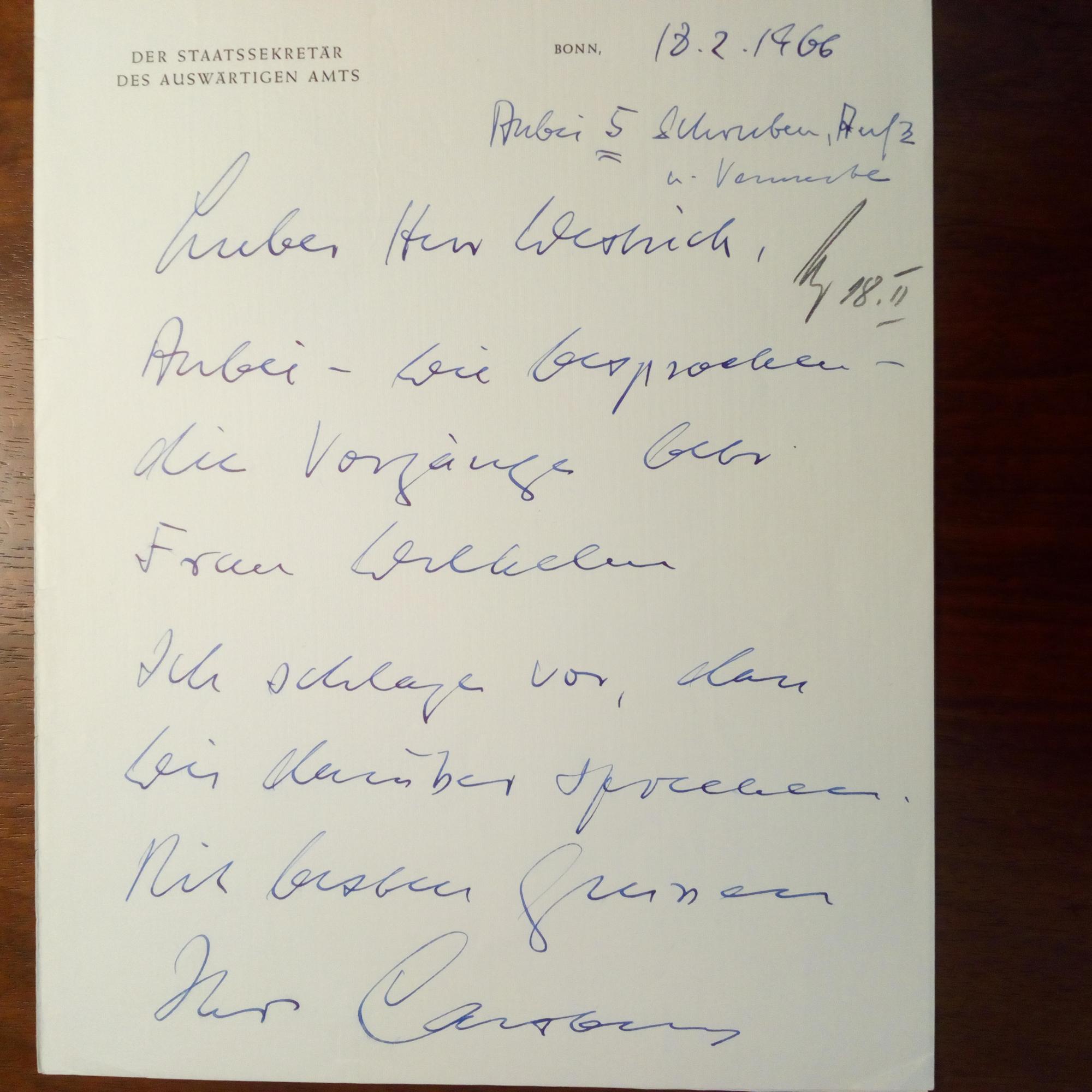 1914-92, Bundespräsident - E. Br. m. U., (Bonn) 18.2.1966, 1 S. kl.4°, Br.kopf als "Staatssekretär des auswärtigen Amtes". An Westrich: wegen der "Vorgänge betr. Frau Wilhelm. Ich schlage vor, dass wir darüber sprechen...". Beiliegt Pfo. m. U. u. Begleitbr. seines Sekretariats.