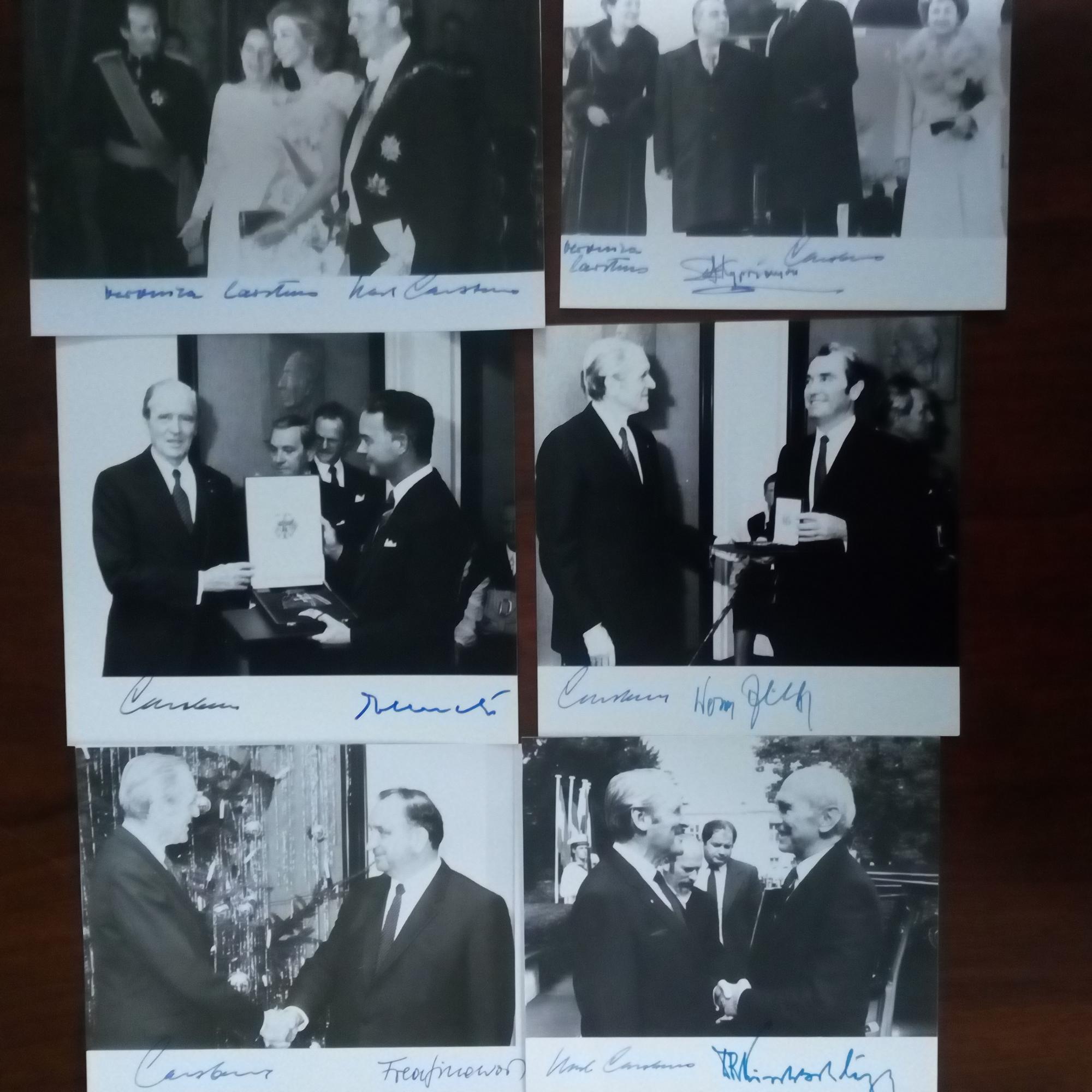 1914-92, Politiker (CDU), Bundespräsident - 7 Fotos ca. 8°quer, je mit seiner U. und der von: 1. Veronika C. (mit dem span. Königspaar), 2. dem griech. Präsidenten Spyros Kyprianou und von ihr, 3. dem österr. Bundeskanzler Fred Sinowatz, 4. dem österr. Bundespräs. Rudolf Kirchschläger, 5. mit Genscher, Schmidt und Stücklen, 3 U., Schmidt mit Autopen. 6. Ordensverleihung an Werner Zeyer, 7. ähnl. an Ernst Albrecht. Beiliegen 4 FDC und 6 SK, je mit U.