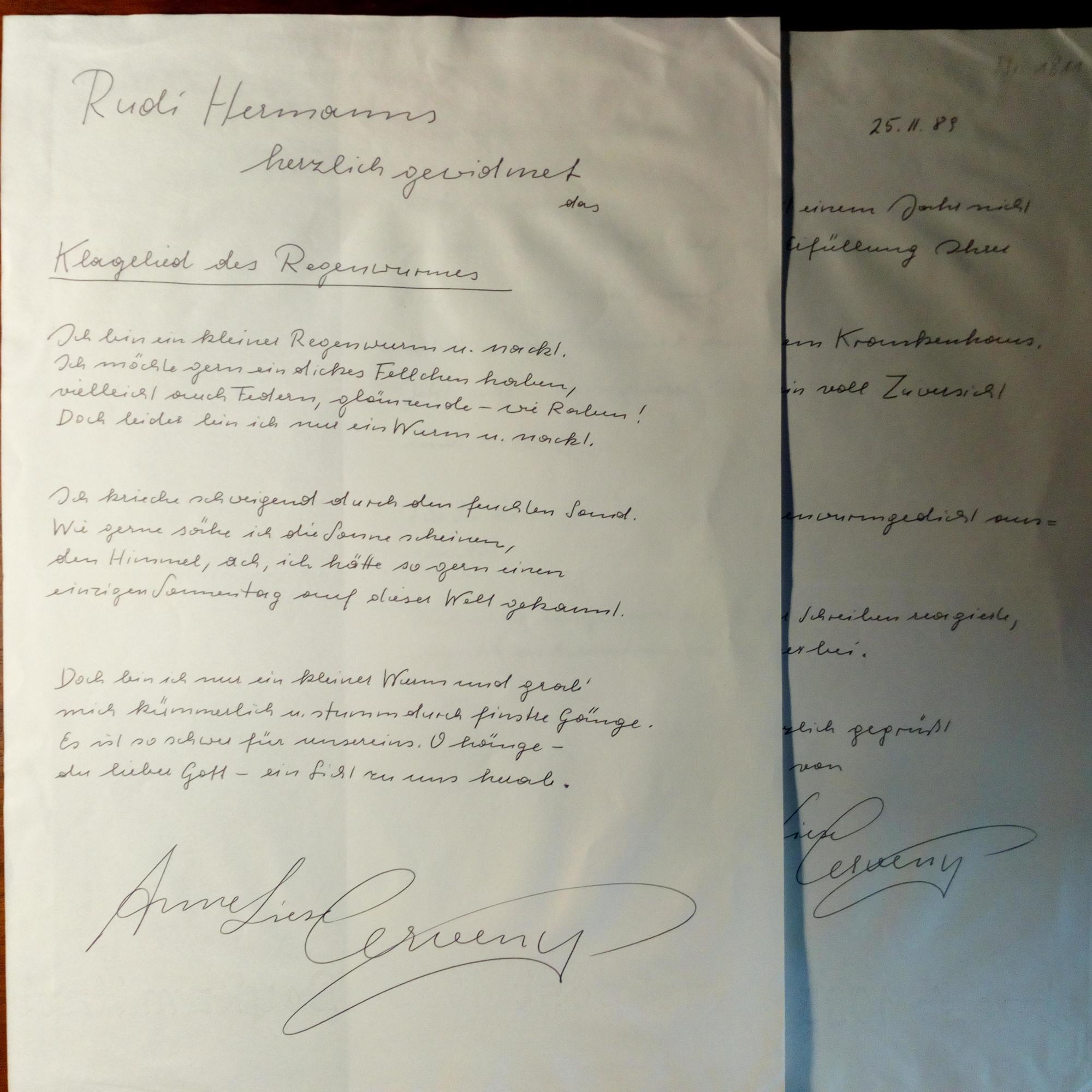 1933-2005, österr. Dichterin - Schönes 4°-Blatt mit e. Gedicht ("Klagelied des Regenwurms", 3 Str. à 4 Z.), Widm. und U. Mit Begleitbr. mit U. und D. 25.2.1989, alles ger. wellig.