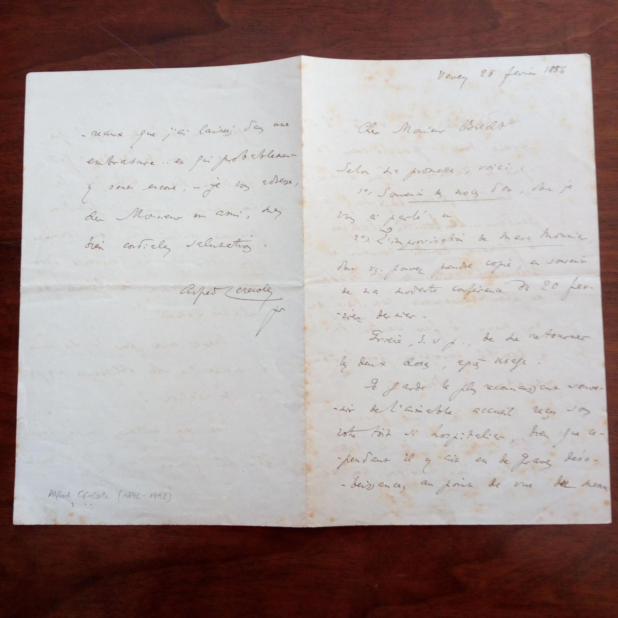 1842-1915, schweiz. Theologe und Schriftsteller - E. Brief mit U., Vevey 28.2.1886, 3 ½ S. gr. 8°, ger. stockfleckig. An Herrn Brecht und Gattin: Schickt Schriften von sich und zu Planungen für einen Besuch, besonders kulinarische Fragen.