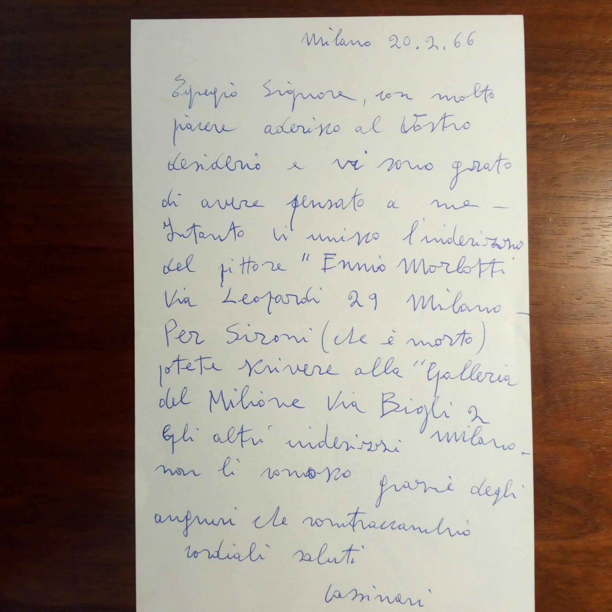 1912-92, italien. Maler - E. Br. m. U., Milano 20.2.1966, 1 S. 8°. An eine Dame, die nach den Rechten an seinem Bildnis des Malers Ennio Morlotti (1910-92) gefragt hatte: ...sono grato di avere pensato a me ... potete scrivere alla "Galleria del Millione" ... Milano...