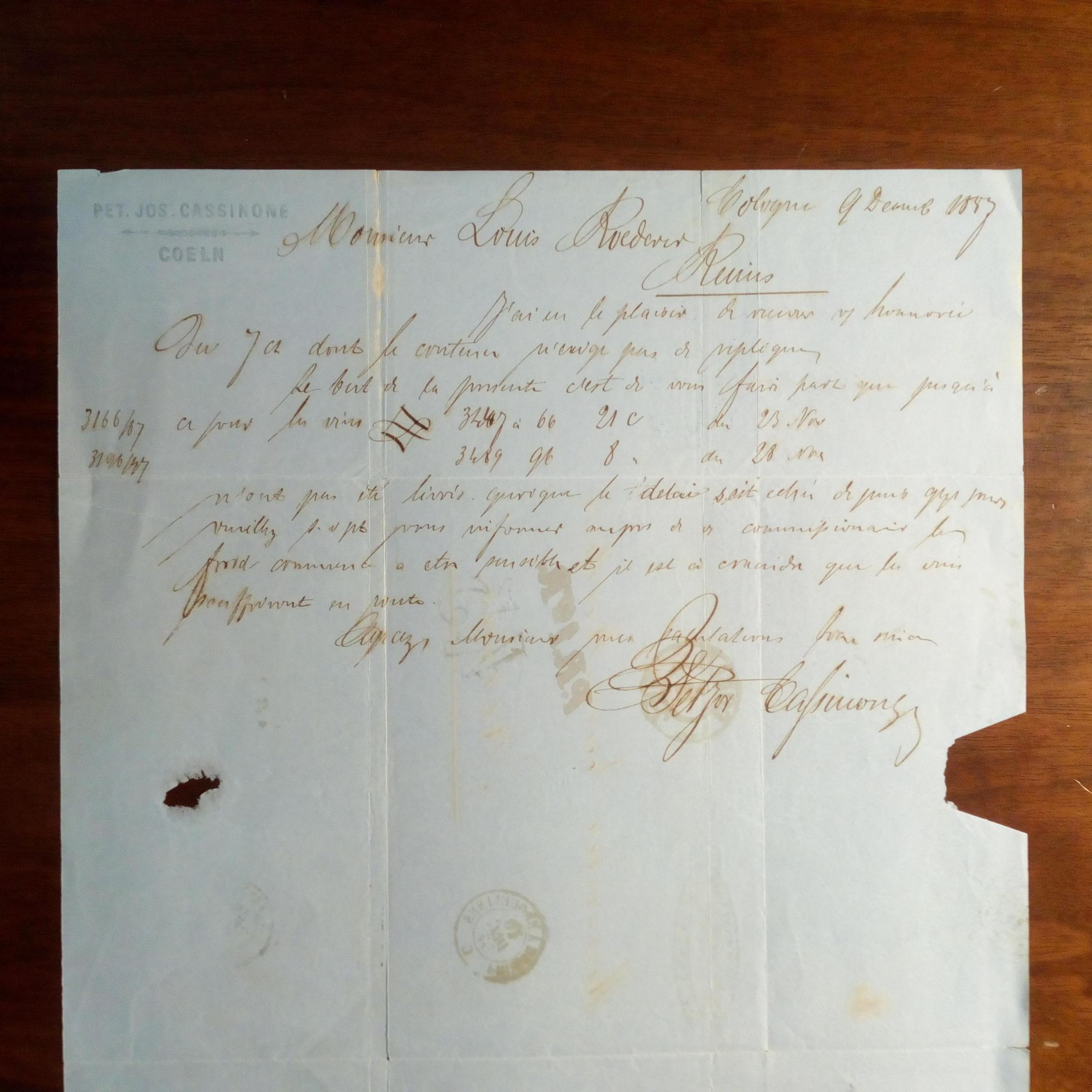 Kaufmann in Köln - E. postal. Faltbr. m. U., 19.12.1887, e. Adresse. An den Champagner-Produzenten und Wein-händler Louis Roederer in Reims: Details zu versch. Bestellungen.