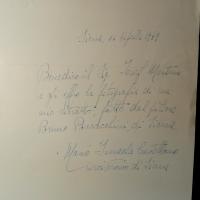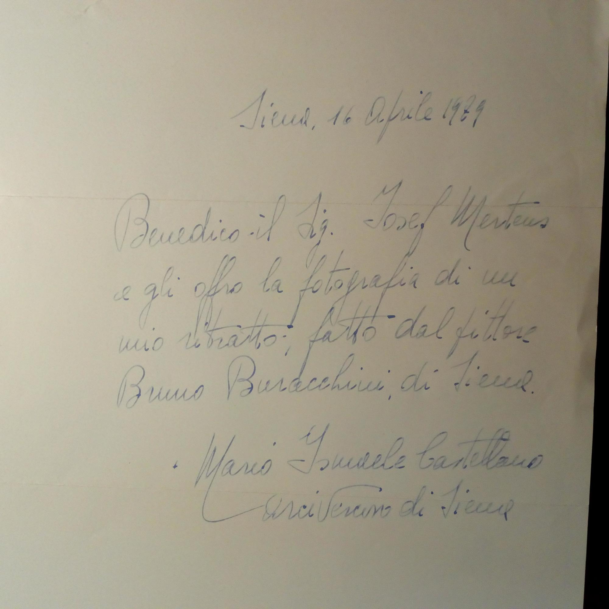 1913-2007, Erzbischof von Siena - 4°-Farb-Tafel mit dem Porträt eines Vorgängers Ascanio II. Piccolomini (1596-1671). Auf Rückseite e. ausführl. Widm. mit U., Siena 16.4.1989. ...offro la fotografia di un mio ritratto, fatto del pittore Bruno Buracchini (1912-82) di Siena... Mit e. postal. Umschlag an einen Sammler.