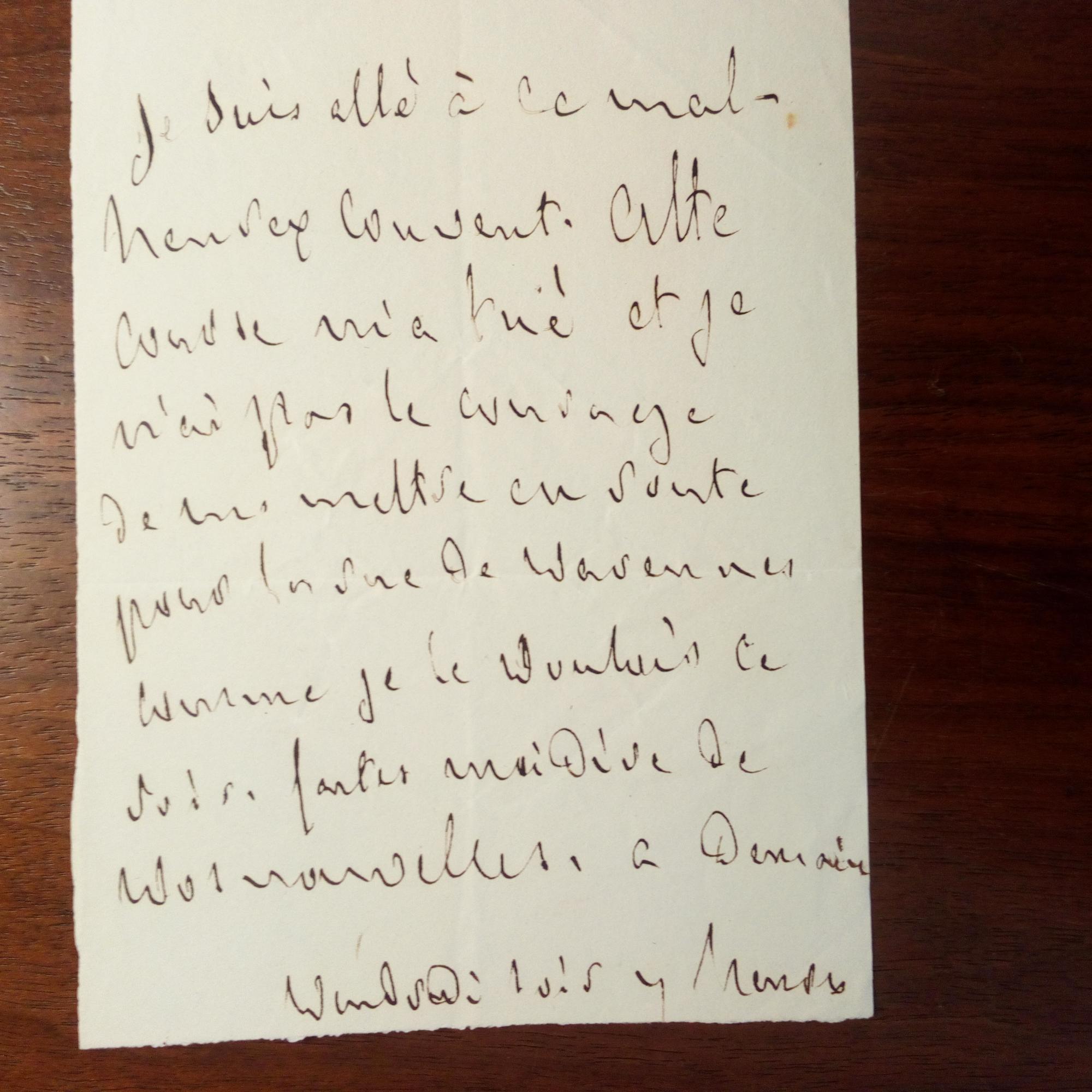 1768-1848, frz. Schriftst. und Staatsmann - E. Mitt. ohne U., (Paris), 1 S. 8°, ger. Knitterspuren. "Je suis allé à ce malheureux convent. Cette course m'a tué et je n'ai pas le courage de me mettre en route pour la rue de Varennes...A Demain/ Vendredi Avis y Mendez".