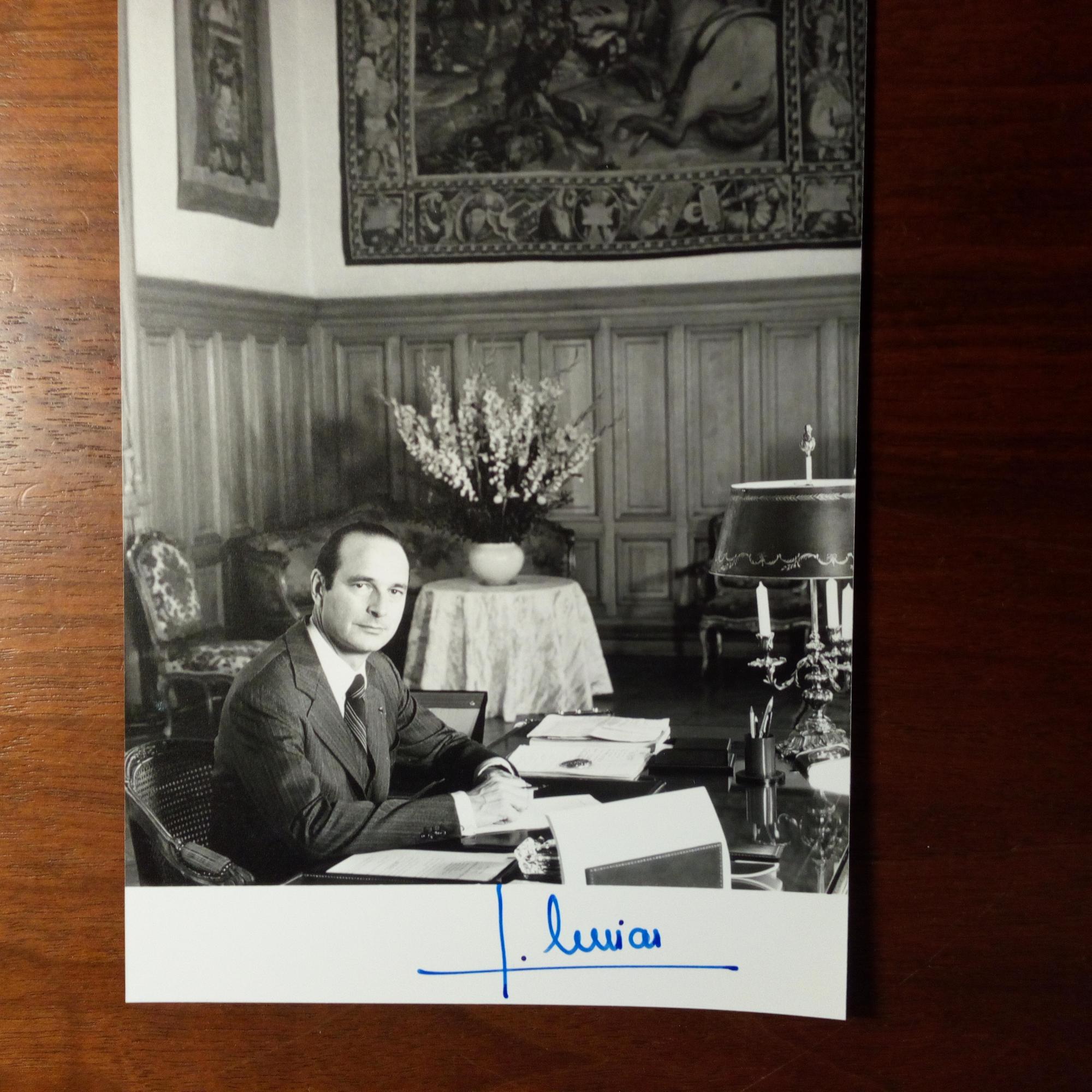 1932-2019, frz. Politiker, Präsident - Pfo. (ca. kl. 8°) mit U. Mit Begleitbrief des städt. Presseamtes von Paris, 9.3.1979 (als Bürgermeister), mit U. des Pressechefs Bernard Niquet (1946-2011).