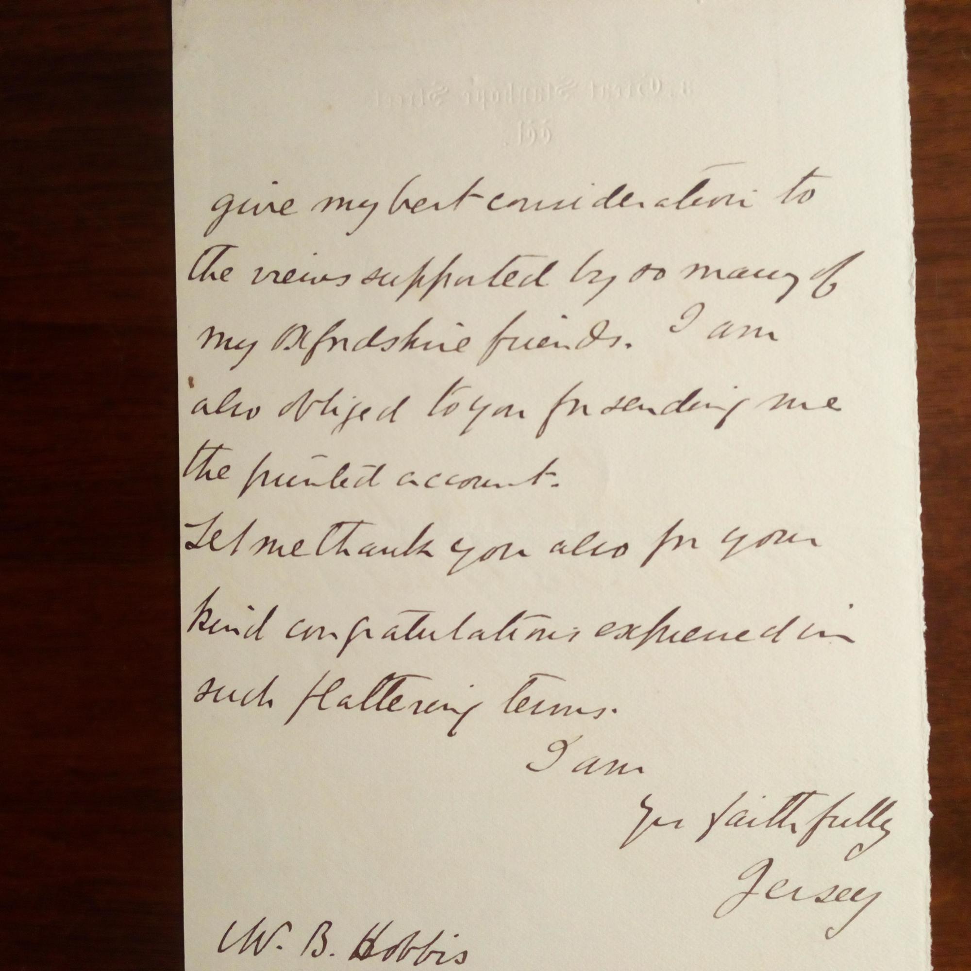 7th Earl of Jersey, 1845-1915, brit. General, Gouverneur von New South Wales - E. Brief mit U. ("Jersey") und D. (London) 18.6.1887, 2 S. 8°, Adressbriefkopf, Lichtverfär-bung am ob. Rand. An W. B. Hobbis betr. "flattery terms" bei einem vergangenen Treffen im "Shedonian Theatre".