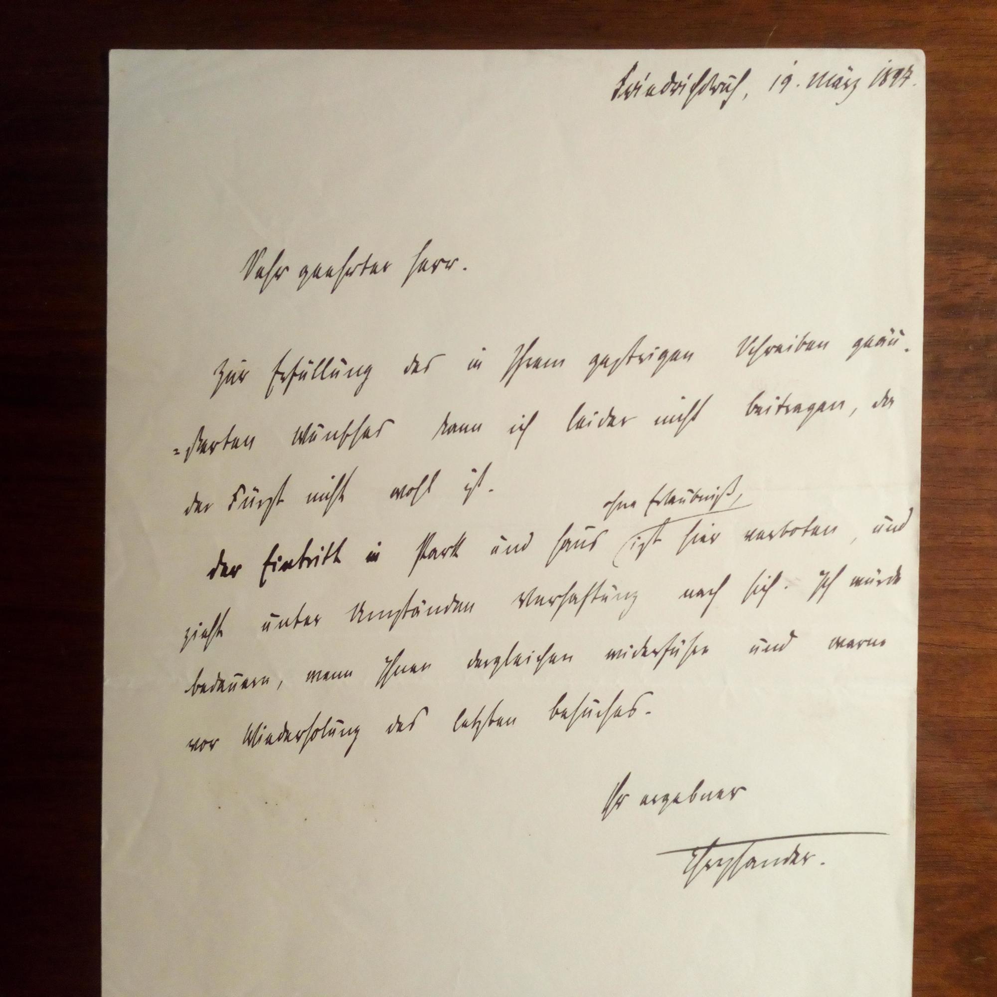 1865-1950, Leibarzt u. Privatsekretär von Otto von Bismarck - E. Brief mit U., Friedrichsruh 19.3.1897, ca. ¾ S. 8°, mit e. postl. Umschlag. Transkription liegt bei. An den Münchner Kunsthändler Hans Franke, "z.Zt. Hamburg": Muss einen Wunsch ablehnen, "da der Fürst nicht wohl ist". ...Eintritt in Park und Haus ohne Erlaubniß, ist hier verboten, und zieht unter Umständen Verhaftung nach sich. Ich würde bedauern, wenn Ihnen dergleichen widerführe und warne vor Wiederholung des letzten Besuches...