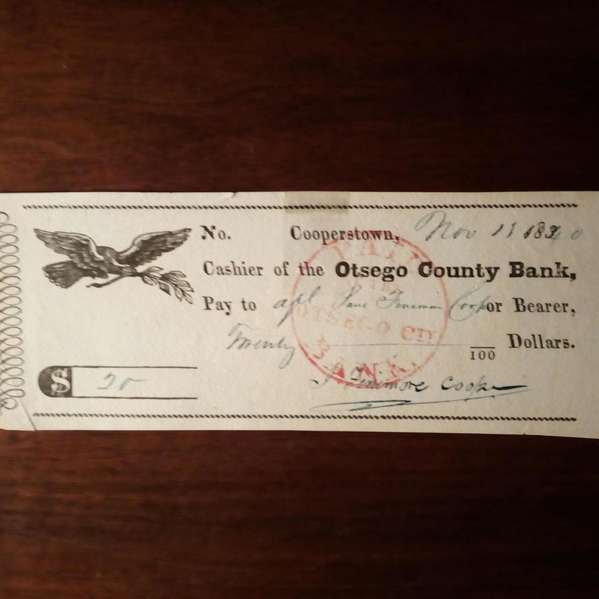 1789-1851, US-Schriftsteller - E. ausgef. Scheck der "Otsego County Bank" in Cooperstown (bei New York) über 20 $, mit U., 13.11.1840, Stempel-entwertet.