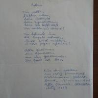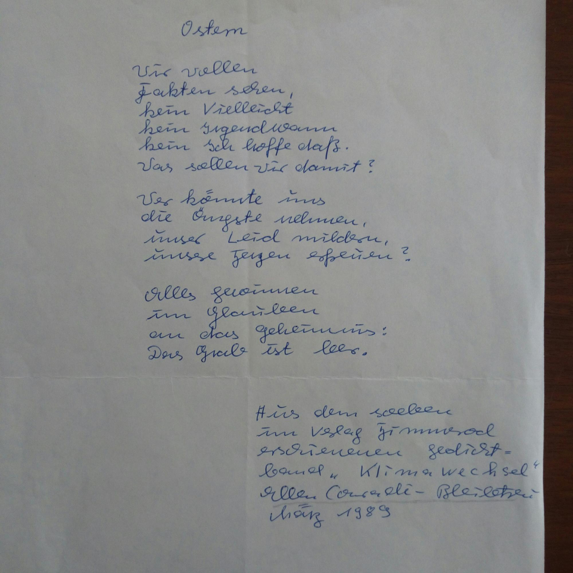 1929-2024, Schriftstellerin - 4°-Seite mit e. Gedicht "Ostern" (14 Z.), e. kl. Erläuterung und U., März 1989.