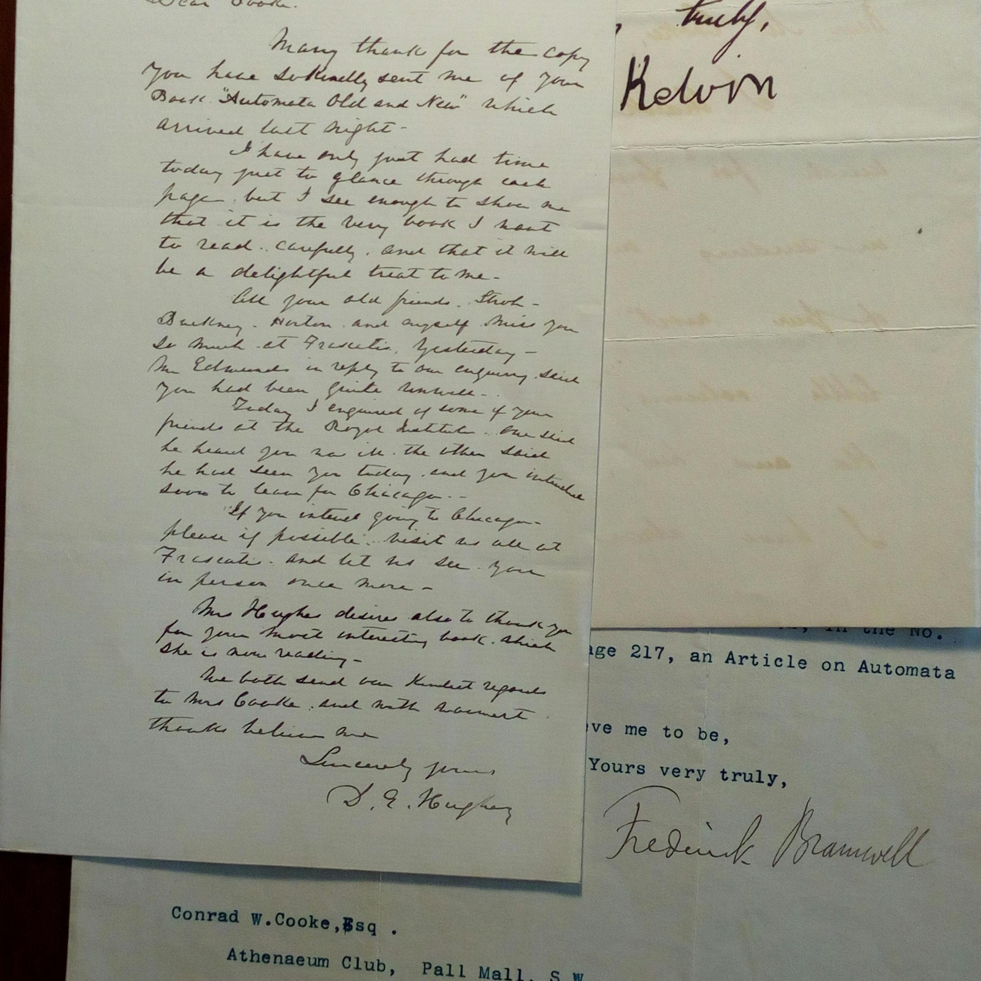 1843-1926, brit. Ingenieur und Salonnier - 4 e. Briefe mit U., alle 1893, (zus. 5 ½ S., versch. Formate). Sehr herzl. Dank für den Erhalt seines Buches "Automata Old and New": von dem Physiker William Thomson (1824-1907) in Glasgow. Aus London: dem Chef der brit. Münz-Anstalt (Br.kopf) Edward Rigg (gest. 1933), den Ingenieuren David Edward Hughes (1831-1900) mit Einladung nach Chicago, und Frederick Joseph Bramwell (1818-1903), Br.kopf der Firma.