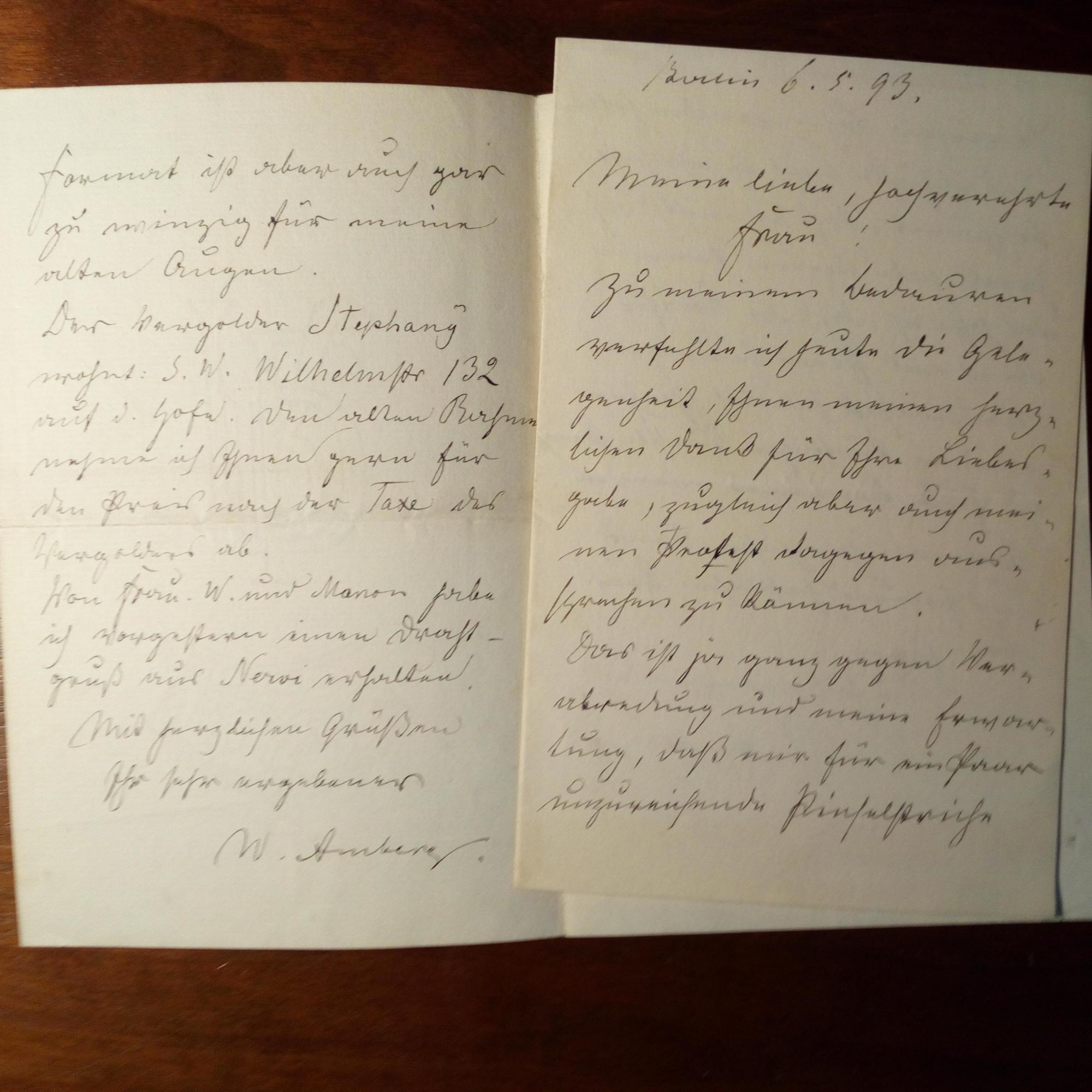 1822-99, Maler - 2 e. Briefe mit U., Berlin 1893, zus. 4 S. 8°. An eine Dame betr. Ankaufs eines Bildes und Bekannte: ...daß mir für ein Paar unzureichende Pinselstriche so reicher Lohn werden sollte...daß die Kräfte, die ich aus Ihrem feurigen Traubensaft sicherlich schöpfe...