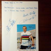 1937-2016, Radsportler - 4°-Blatt mit mont. Pfo. (italien., als Weltmeister) mit U. Darüber Widm. für das Restaurant "Seimer Eck" und U., Baden-Baden 29.4.1967. Weitere U. und kl. Skizze eines Rennrades wohl von seinem Bruder Willi A. Auf Rückseite E., U. und D. 6.12.1967, von dem Schlagersänger Bully Buhlan (1924-82) und E. und U. von der Schlagersängerin Nina Westen (eigtl. Ingrid Werner, geb. 1935).