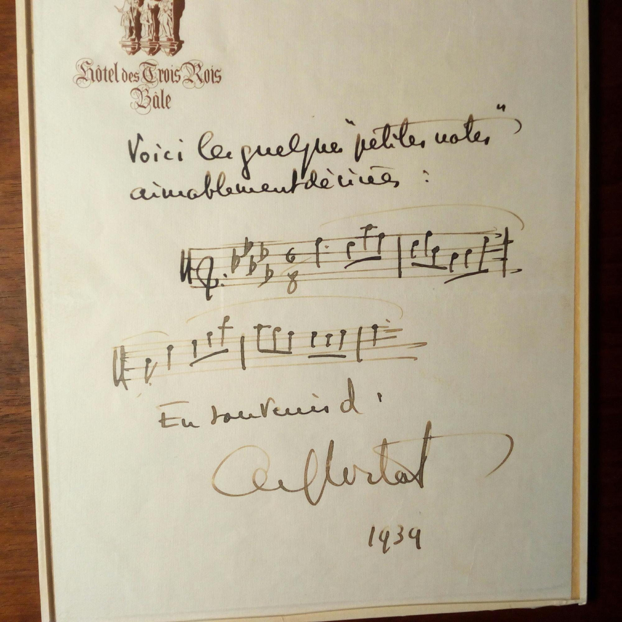 1877-1962, frz. Pianist, Komponist und Dirigent - 8°-Blatt mit e. Zeilen, 2 e. Notenzeilen (zus. 4 Takte), E., U. und Jahr 1939, Briefkopf des Hotels "Trois Rois" in Basel. Unter Glas gerahmt.