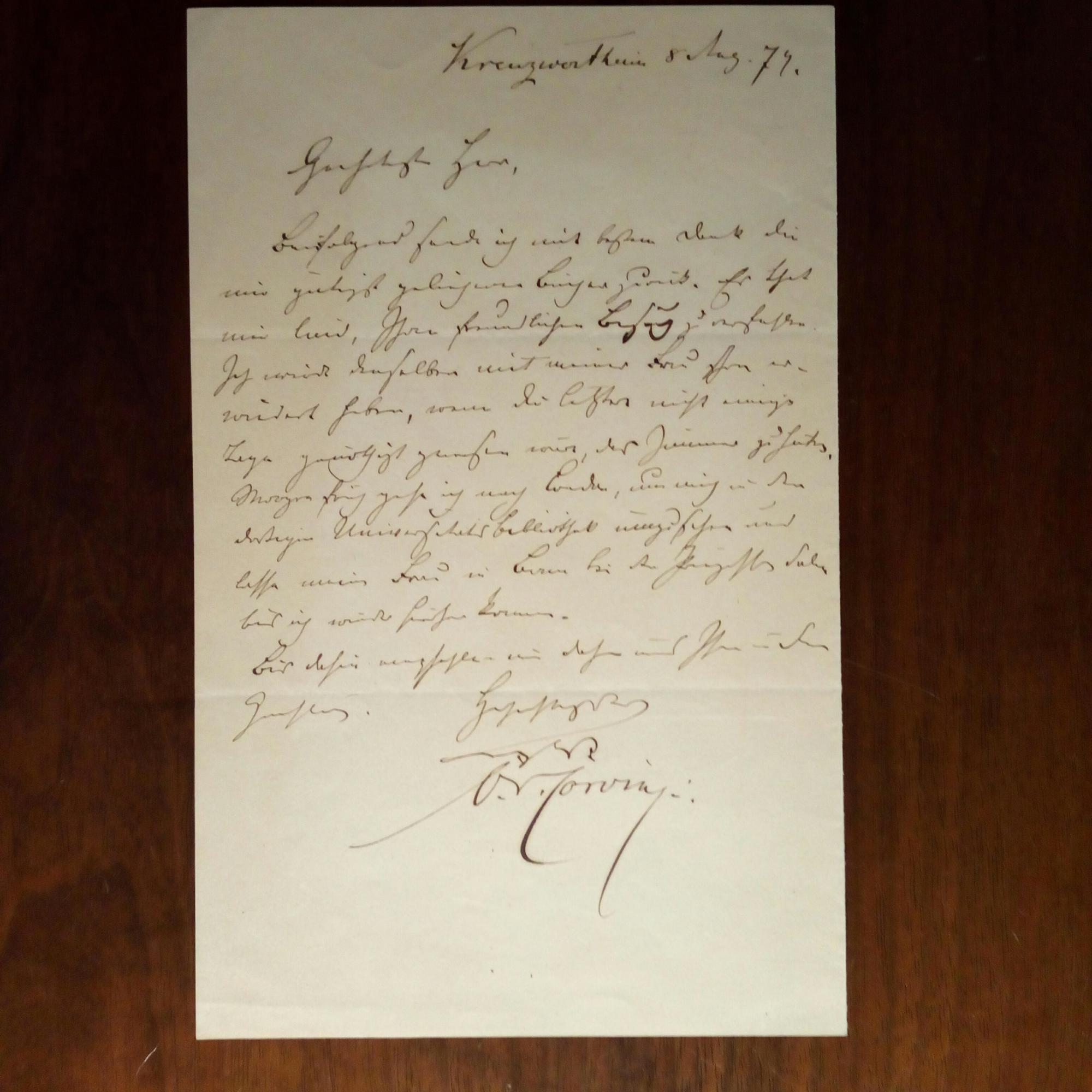 1812-88, Journalist, Schriftsteller und Revolutionär (Autor des "Pfaffenspiegels") - E. Brief mit U., Kreuzwertheim (Spessart) 8.8.1874, ¾ S. 8°. Schickt Bücher zurück und kann einen Besuch nicht empfangen, denn: ...Morgen früh gehe ich nach London, um mich in der dortigen Universitätsbibliothek umzusehen und lasse meine Frau in Bern...