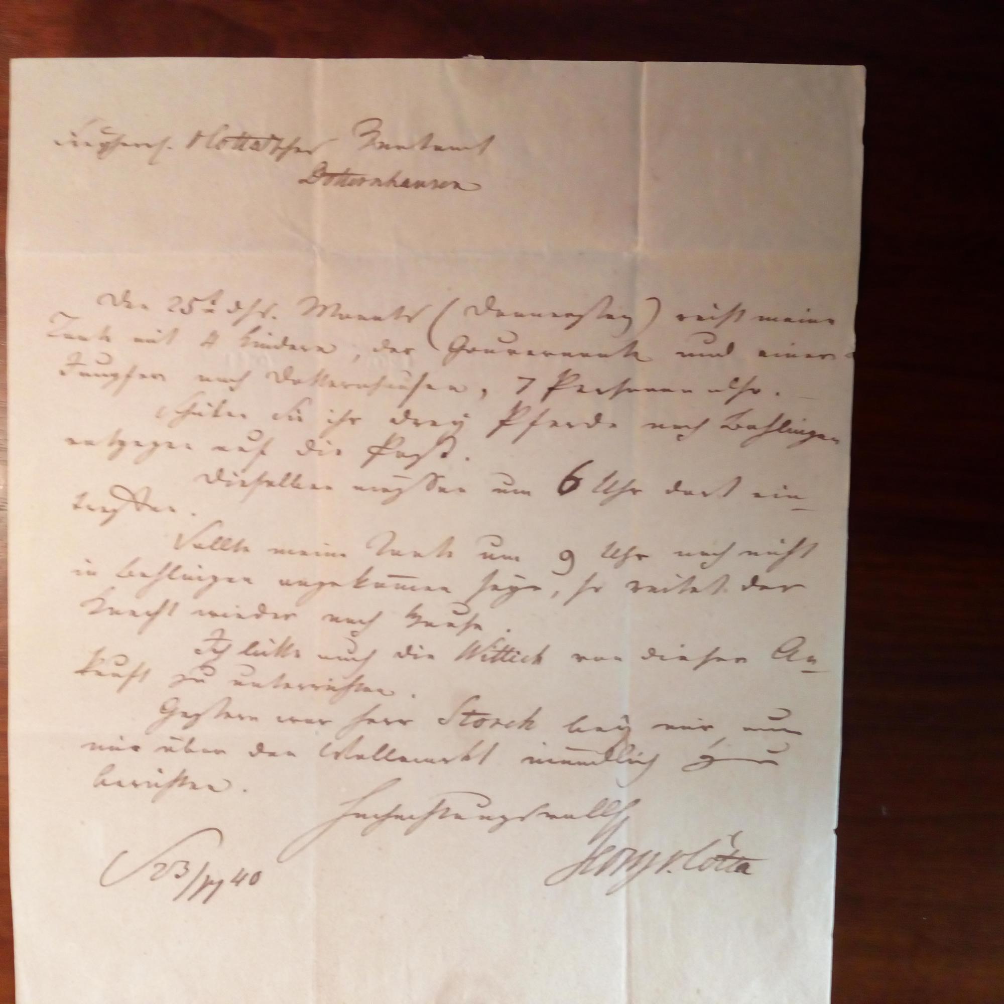 1796-1865, Verleger und Politiker - 4 e. postal. Faltbriefe mit U., je: Stuttgart, ca. 1 S. 4°, mit e. Adresse, Siegelrest u. Poststempel. An den Verwalter von Dotternhausen (von s. Vater Johann Friedrich C. erworbenes Rittergut bei Balingen): 23.6.1840: Kündigt die Ankunft seiner Tante mit Anhang an. 1.7.1842: Betr. Lieferung von 2 Pferden. 26.2.1844: Befiehlt versch. Versuche zur Düngung von Ackerböden u. Wiesen, "da ich von meinen Gütern künftig leben muss...". 5.3.1846: Detaillierte Anweisungen zum "Feldgeschäft", das "gleichbald stark beginnen wird...".