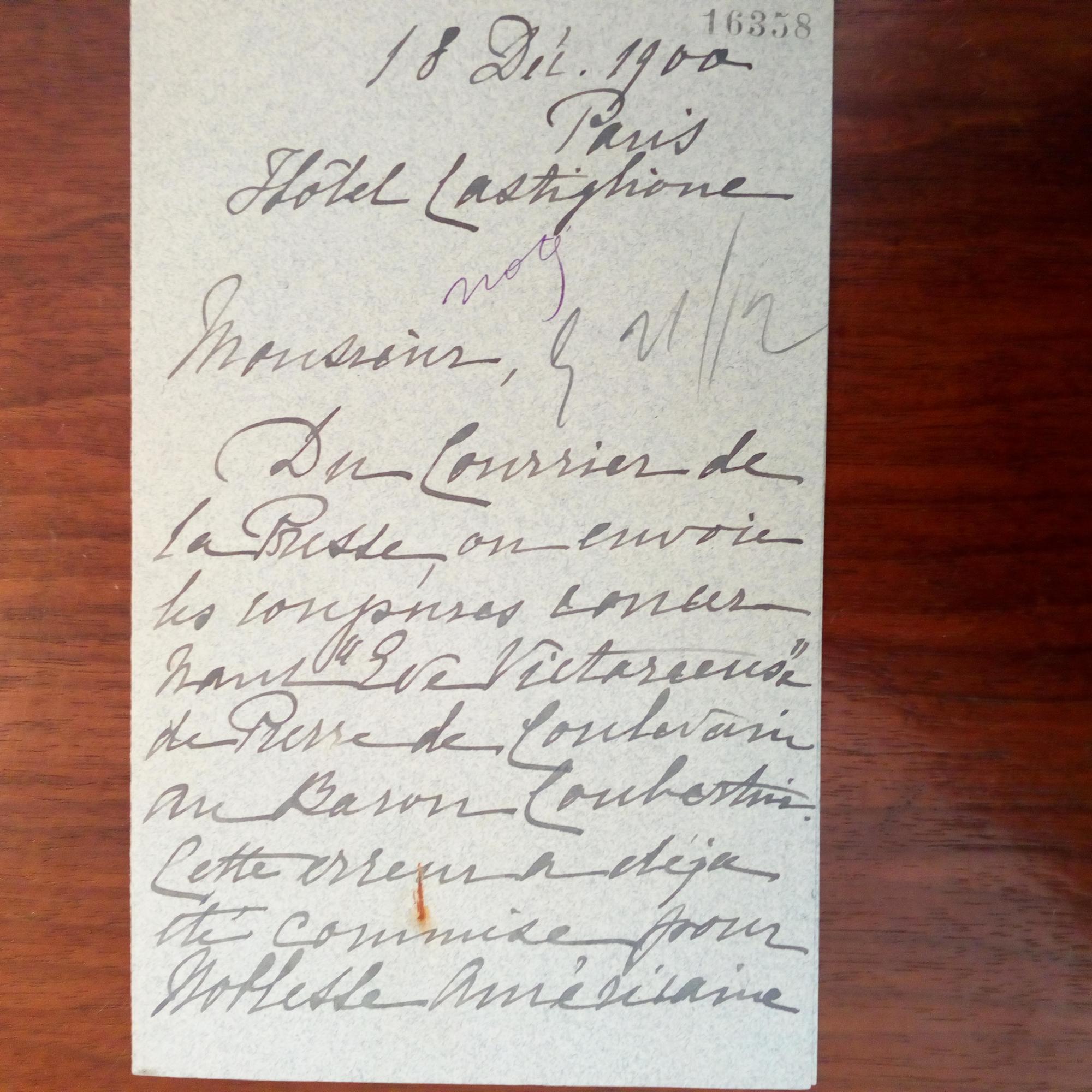 eigtl. Jeanne Philomène Laperche, 1853-1927, frz. Schriftstellerin - E. Brief mit U., "Hôtel Castiglione", Paris 18.12.1900, 1 ½ S. 8°, ger. Gebr.spuren. Schickt Schriften zu dem "Event Victoreuse de Pierre de Coulevain au Baron Coubertin". In ironischem Ton.