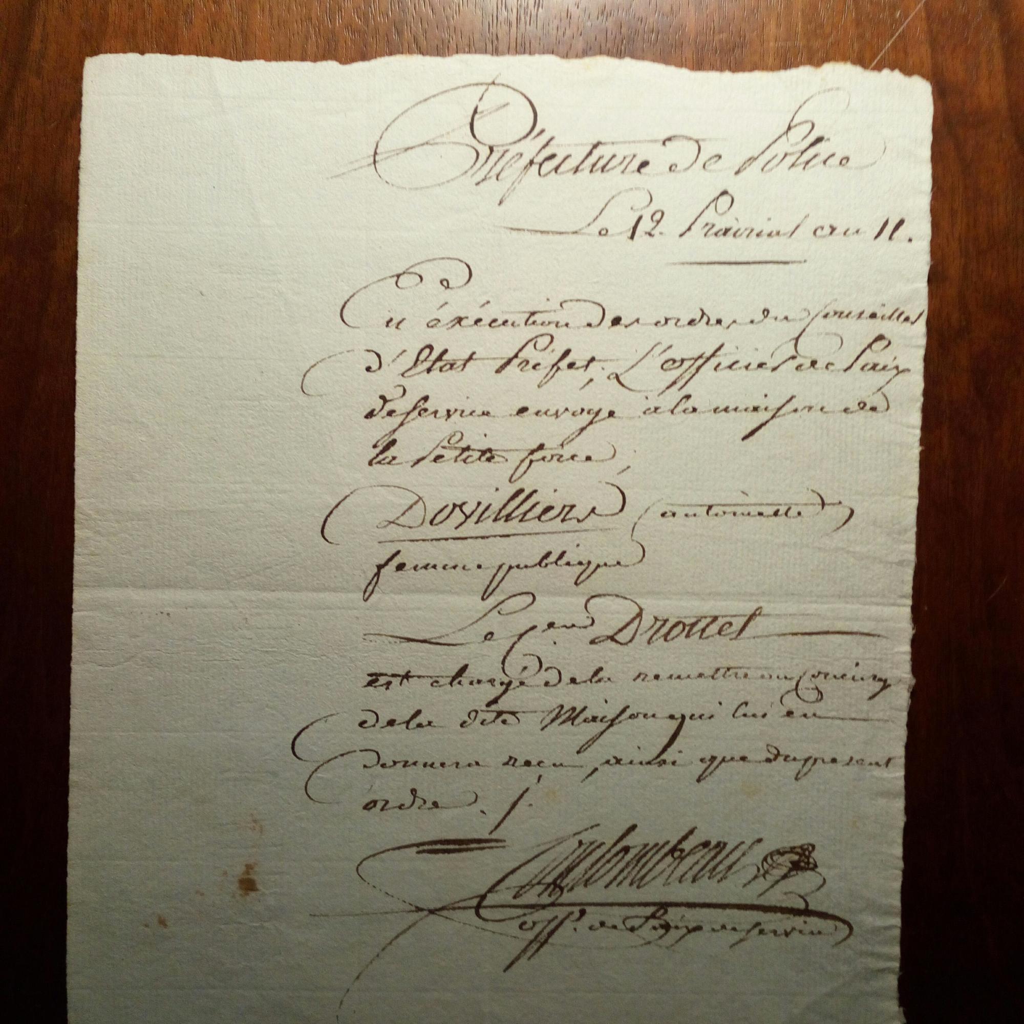 geb. 1751, "Secrétaire-greffier de la Commune de Paris" - Amtl. Schreiben mit U., Préfecture de Police, "Le 12. Prairial an II" (31.5.1794). An den frz. General Drouet (wohl Jean-Baptiste, 1765-1844): Auf Befehl des "Conseiller d'Etat Préfet" wird er verpflichtet, die "femme publique" Antoinette Dovilliers in der "Petite force" (Pariser Frauengefängnis) abzuholen und wieder bei sich aufzunehmen.