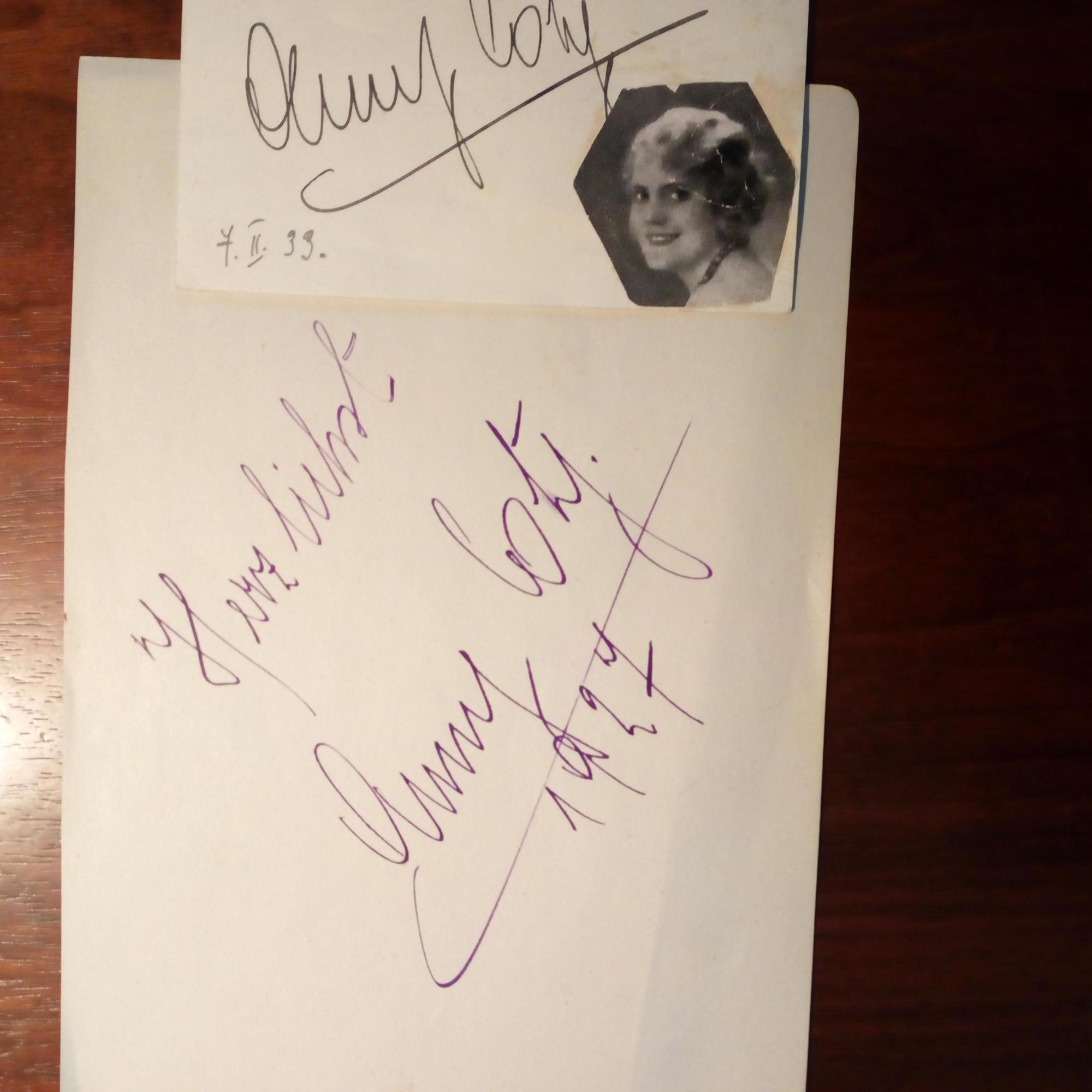 eigtl. A. Mikorey, 1912-85, Wiener Operettensängerin und Filmschauspielerin - Kärtchen mit mont. kl. Druck-Pfo., U. und D. 7.2.1933, kl. Gebr.spuren. Beiliegt 8°-Blatt mit U. und Jahr 1927.