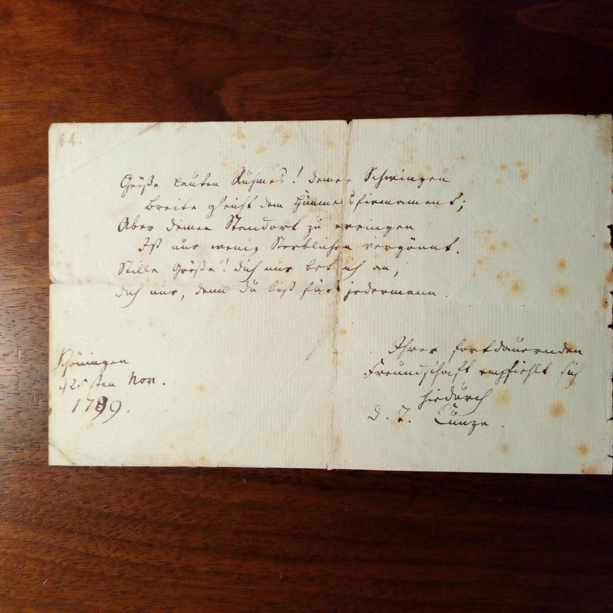 1765-1843, Dichter - 8°quer-Blatt mit e. Gedicht (6 Z., "...Stille Größe! Dich nur bet ich an,/ dich nur, denn du bist für jedermann".), E., U., Schöningen (Niedersachsen) 25.11.1799. Auf Rückseite längerer Eintrag von and. Hand. Leichte Altersspuren.
