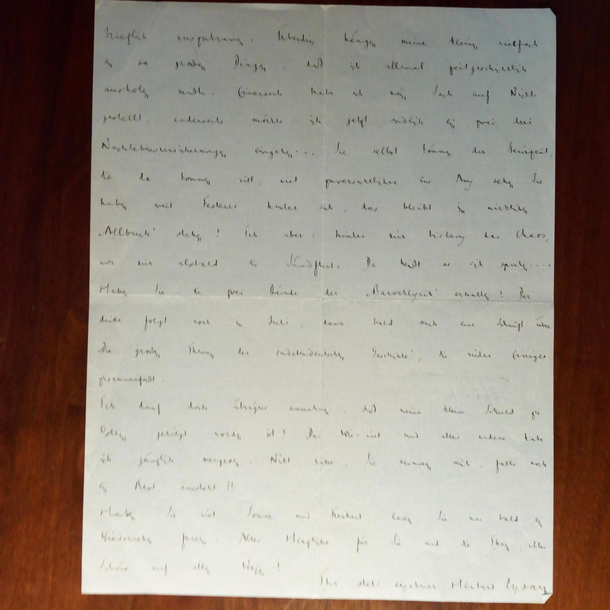 1896-1985, Germanist - E. Brief mit U., München 3.7.1937, 2 S. 4°, kl. Schrift. Freundschaftlich an den Literaturwissensch. Philipp Witkop (1880-1942) in Freiburg: Über s. geplanten Umzug in die Schweiz ("hinter mir bislang das Chaos, vor mir alsbald die Sündflut..."). ...Haben Sie die zwei Bände der "Barocklyrik" erhalten? Der dritte folgt noch im Juli...