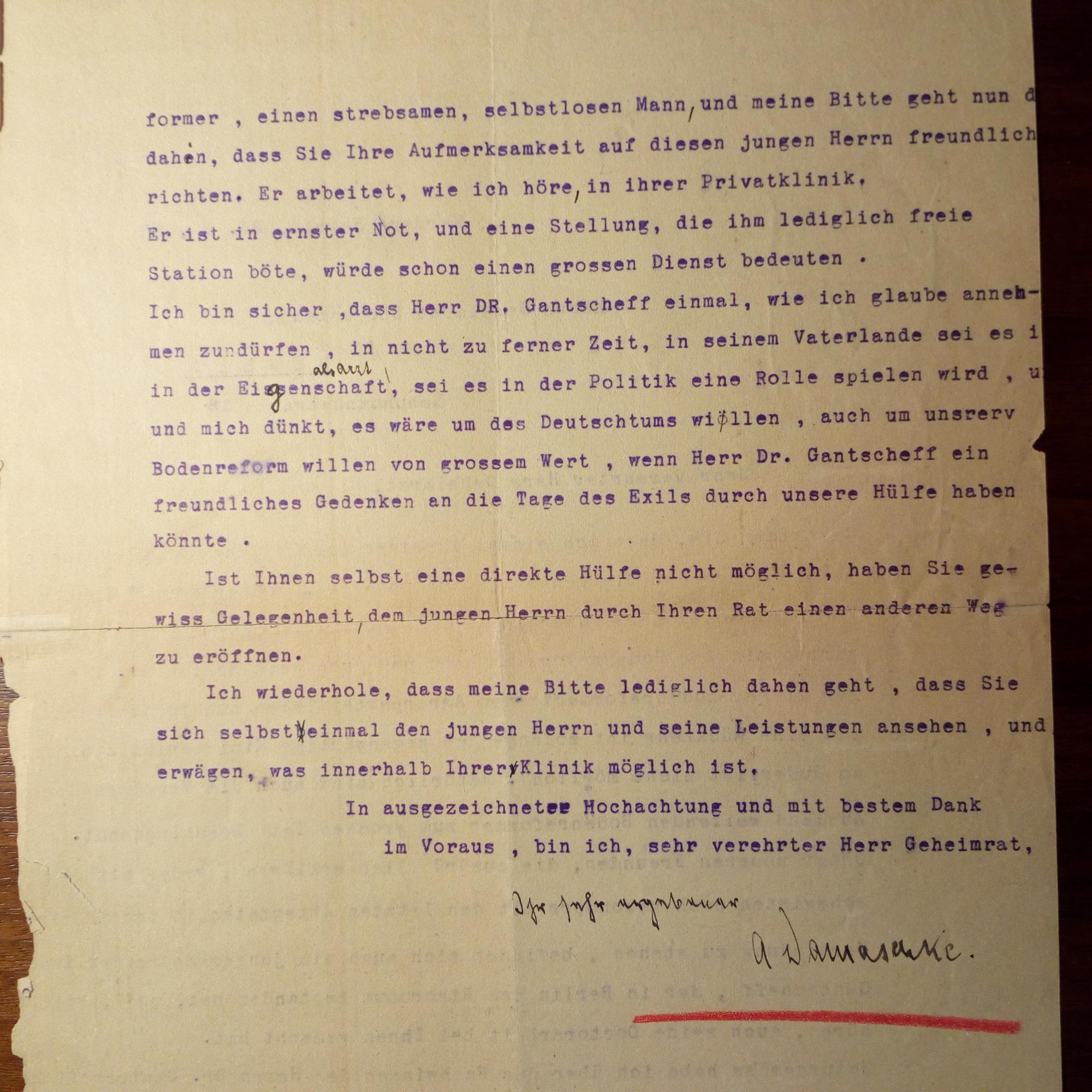 1865-1935, Nationalökonom - Brief mit U., Werder (bei Potsdam) 23.9.1925, 2 S. 4°, Briefkopf als Vors. des "Bundes Dt. Bodenreformer", Vermerk, Altersspuren mit kl. Verlust. An den Gynäkologen Ferdinand Strassmann (1866-1938) in Berlin: Bittbrief für den bulgar. Medizner Iwan Gantscheff, der eben bei ihm promoviert hatte: ... Rückkehr ist, solange das gegenwärtigee Ministerium Zankoff am Ruder ist, nicht möglich. Natürlich sind auch die Vermögen der...Bodenreformer...beschlagnahmt...
