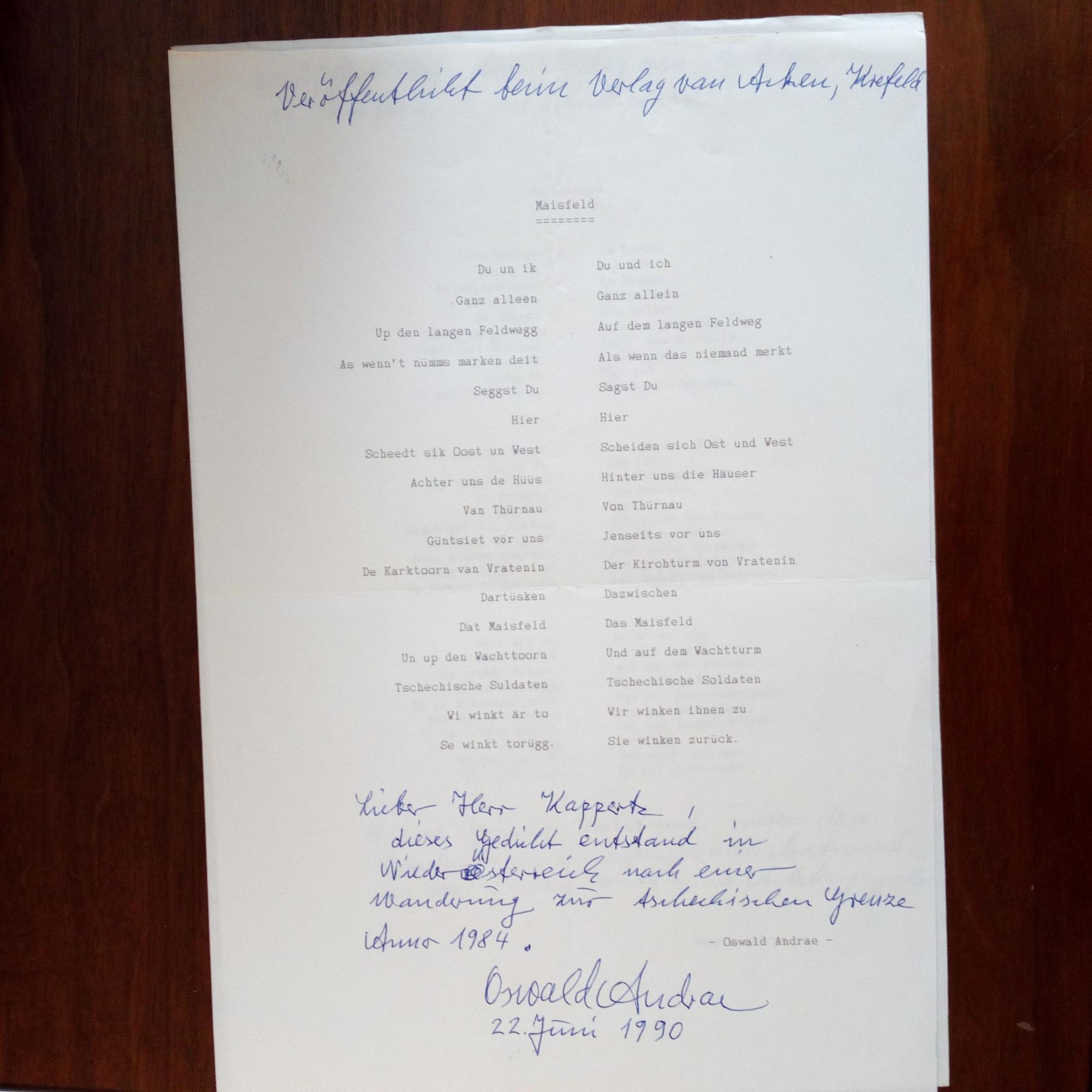 1926-97, plattdt. Schriftsteller - 2 x 4°-Blatt, je mit Gedicht-Typoskript ("Harvstleed" und "Maisfeld", je in plattdt. und in dt. Sprache) mit e. ausführl. Erläuterungen, eines mit U. u. D. 22.6.1990 Dazu e. beschriebenes Kärtchen des Verlages "Dichten im Dialekt": "Dreeundartig Mullhülten...", mit e. postal. Umschl. (U. im Abs.).