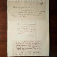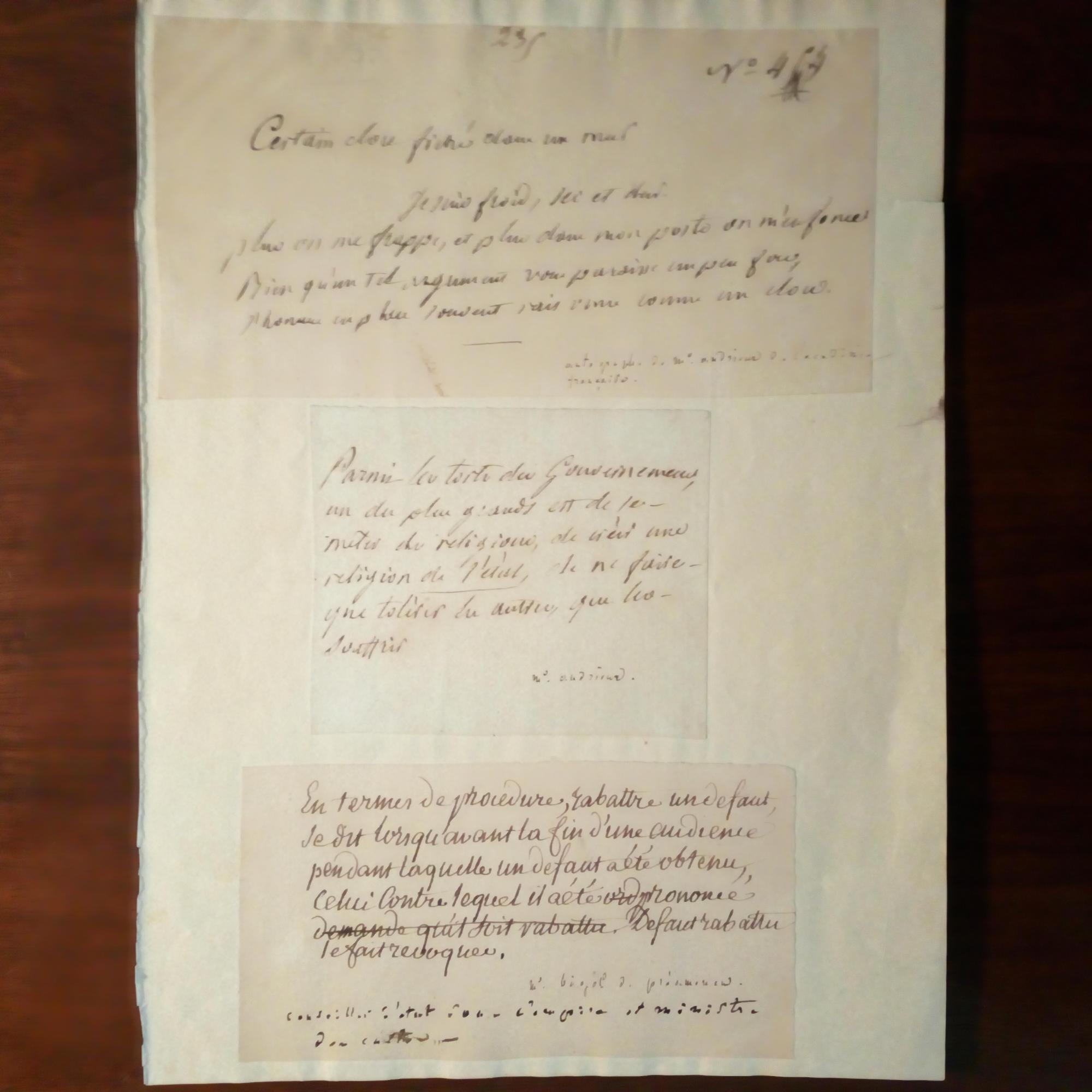 1759-1833, frz. Jurist, Gelehrter und Dichter - 3 kl. Blätter mit mehrzeiligen Zitaten, zus. mont. auf kl. 4°, 2 davon von ihm selbst geschr., ger. Gebr.spuren. Mit kl. Sammlerblatt.