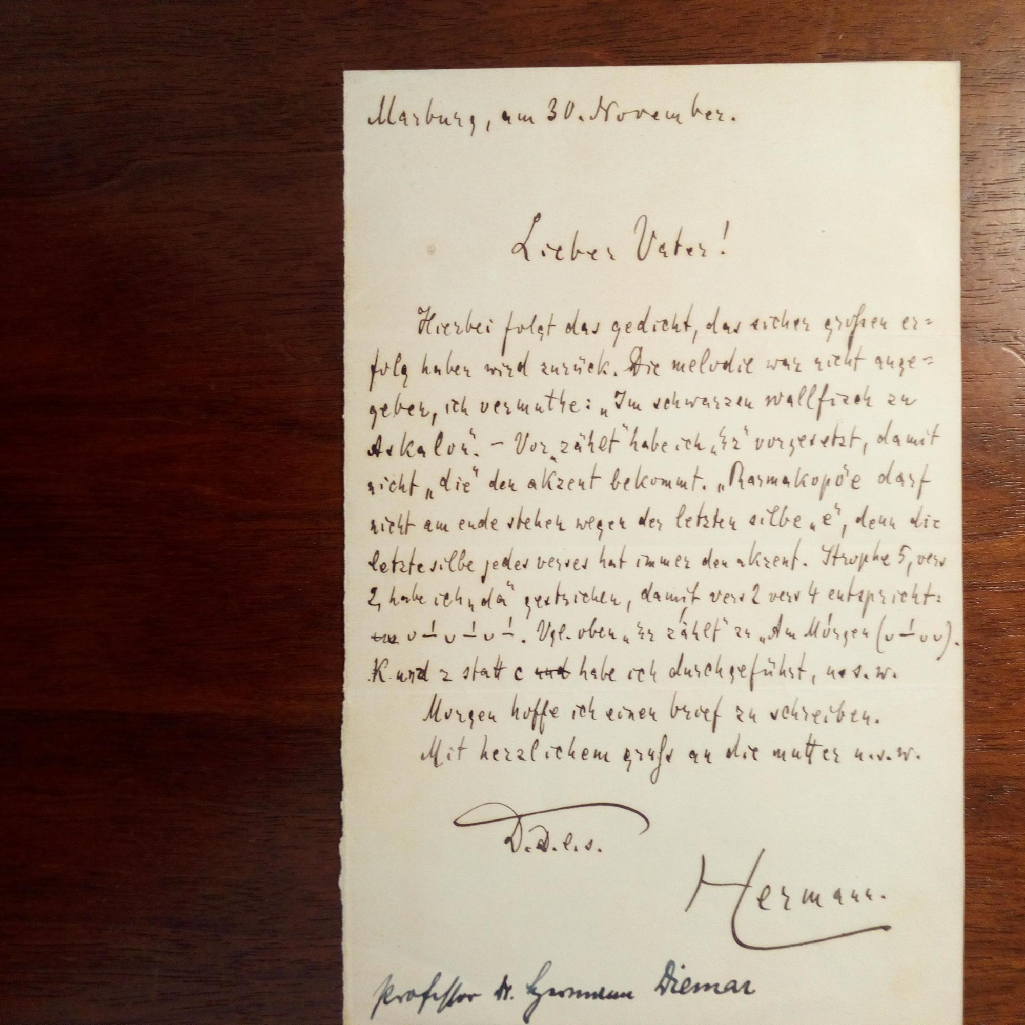 1865-1910, Historiker - E. Brief mit U. ("Hermann"), Marburg, 1 S. kl. 8°, kl. Schrift. An s. Vater: ...Hierbei folgt das gedicht, das sicher großen erfolg haben wird zurück. Die melodie ist nicht angegeben, ich vermuthe: "Im schwarzen wallfisch zu Askalon" (Stud.-Lied von Victor von Scheffel) - Vor "zählt" habe ich "Er" vorgesetzt, damit nicht "die" den akzent bekommt...
