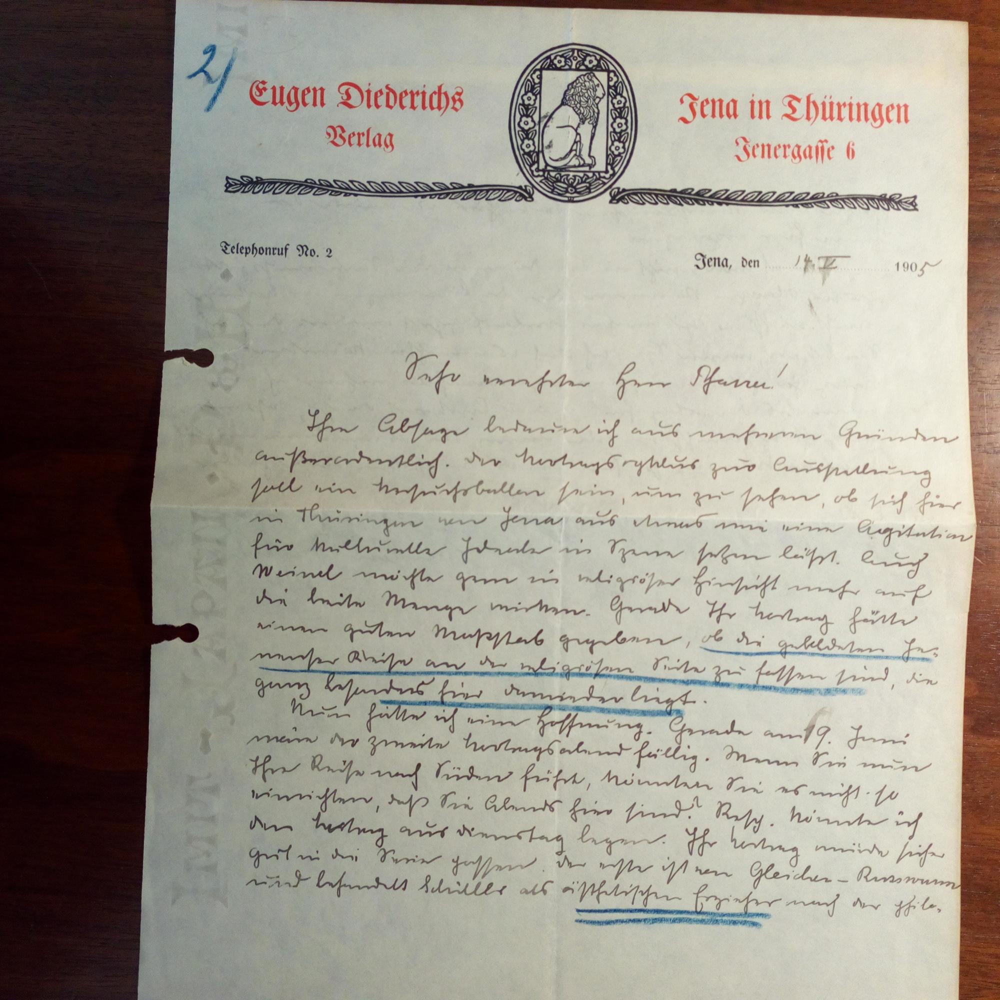 1867-1930, Verleger - E. Br. m. U., (Jena) 14.5.1905, 1 ½ S. gr.4°, schöner Br.kopf des Verlages, teilw. unterstrichen, Gebr.spuren. Bittet einen "Herrn Pfarrer", doch noch seinen Vortrag in Jena zu halten, und zwar gleich nach Gleichen-Russwurm, der über "Schiller als ästhetischen Erzieher" spricht. Er möchte bestimmte Kreise "an der religiösen Seite fassen", die "ganz besonders hier darniederliegt...".