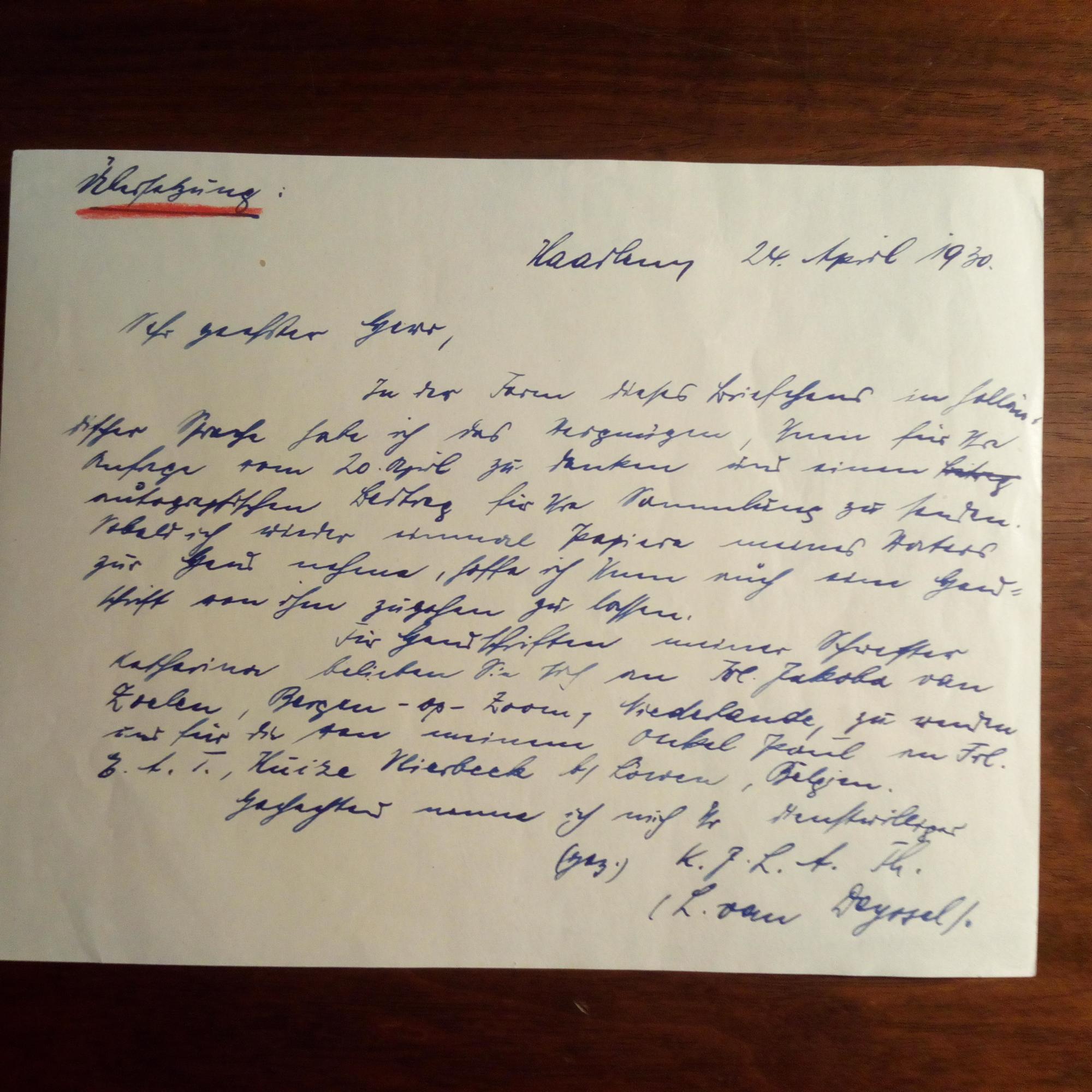 1864-1952, niederländ. Schriftsteller - E. Br.karte m. U., Haarlem 24.4.1930, 2 S.. Dazu die dt. Übersetzung. An einen Sammler m. biograph. Angaben u. weist auf Familienangehörige hin.