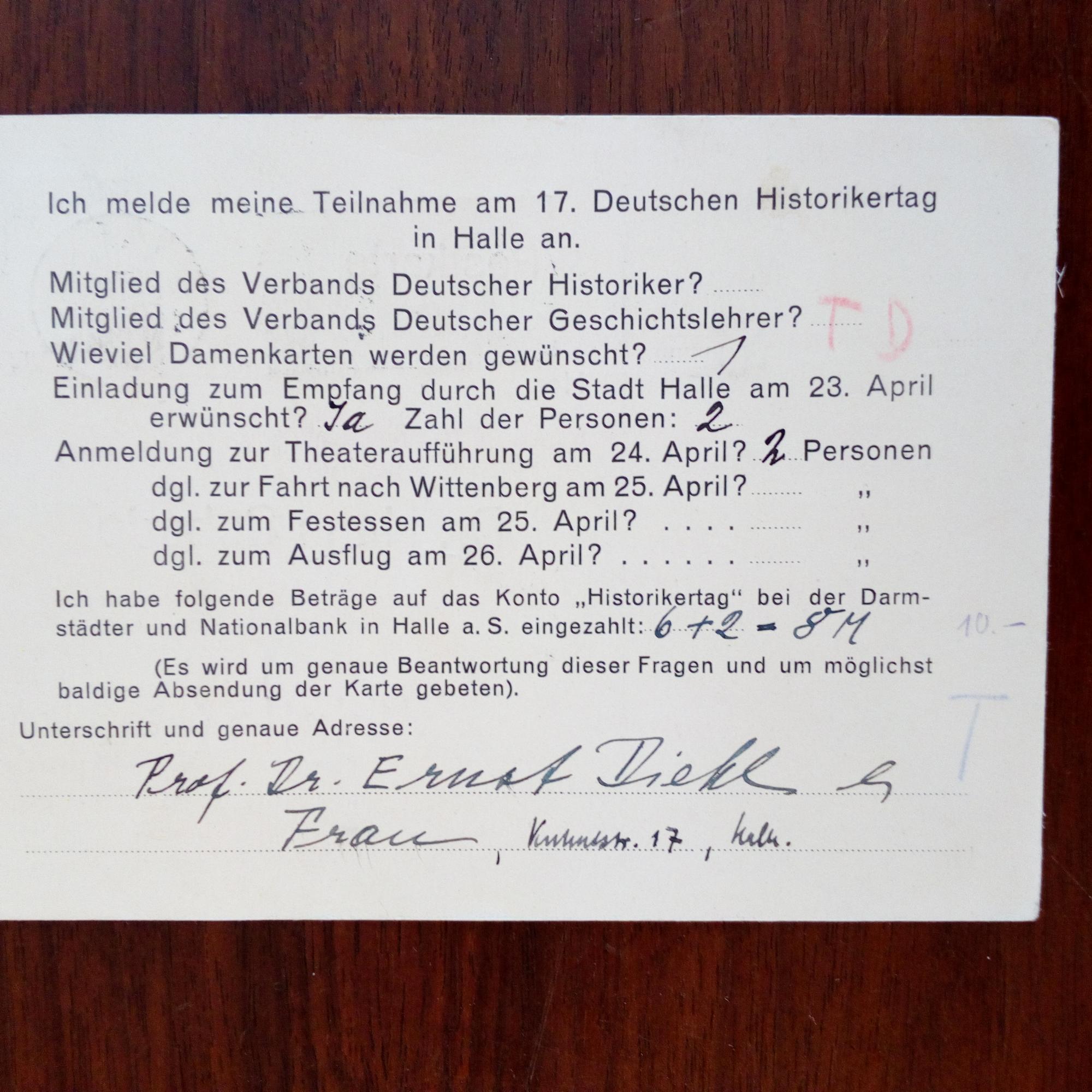 1874-1947, Altphilologe - E. ausgef. Anmeldung zum 17. Dt. Historikertag in Halle m. U. Als postal. Postkarte (Halle 5.3.1930).