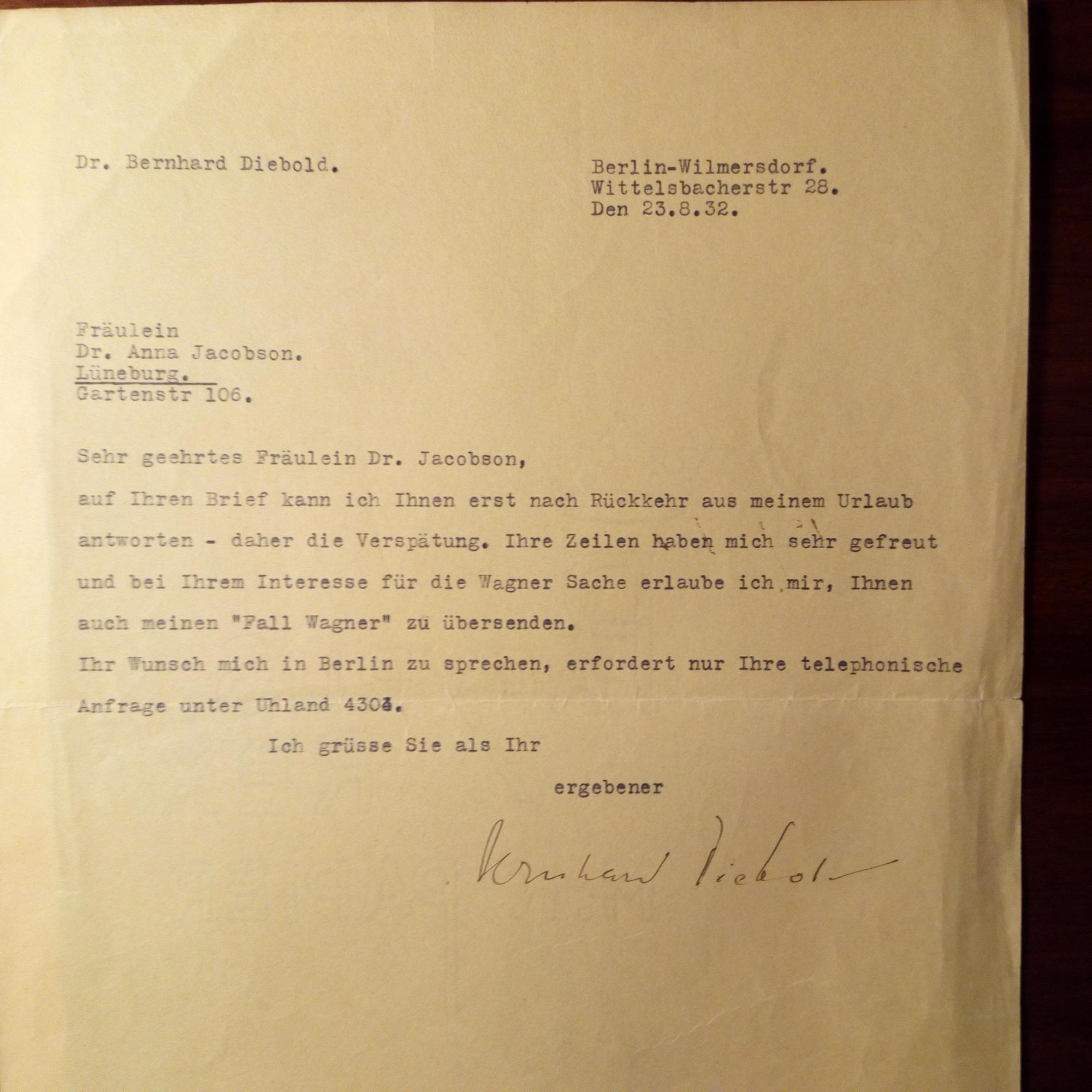 1886-1945, schweiz. Dramaturg, Schriftsteller und Kritiker - Brief mit U., Berlin 23.8.1932, ¾ S. 4°. An die Literaturwiss. Anna Jacobson (1888-1972) in Lüneburg: ...bei Ihrem Interesse...erlaube ich mir, Ihnen auch meinen "Fall Wagner" zu übersenden...