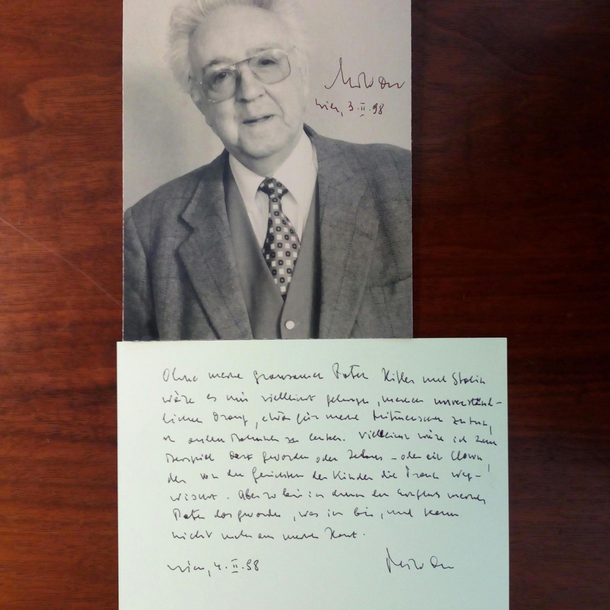 1923-2005, ungar.-österr. Schriftsteller - Pfo. mit U., Wien, 3.2.1998, weitere U. auf Rückseite. Dazu Karte mit e. längerem Zitat, U., Wien 4.2.1998. Beiliegen: Karte mit e. längerem Zitat aus seinem Buch "Die weiße Stadt" mit Widm. und U., 12.10.2004, Karte mit kurzem Zitat, Widm. und U. (1993). (4 Autographen).